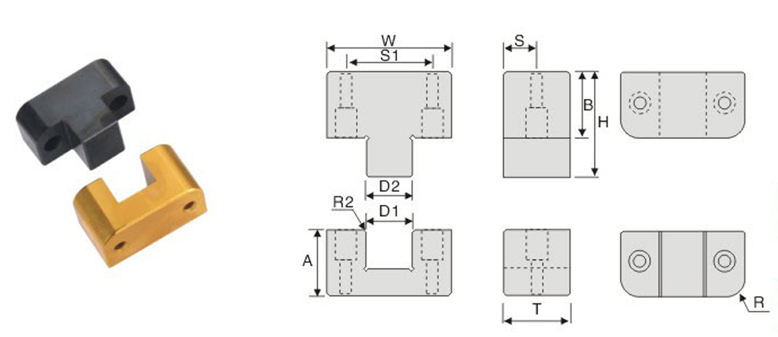 Type | W 0 -0.005 | T 0 -0.002 | A 0 -0.002 | B 0 -0.002 | C | OVERALL HEIGHT | D1 0.0002 0 | D2 0.0002 0 | H | R RADIUS | R2 | S ±0.010 | S1 ±0.010 | SHCS | |