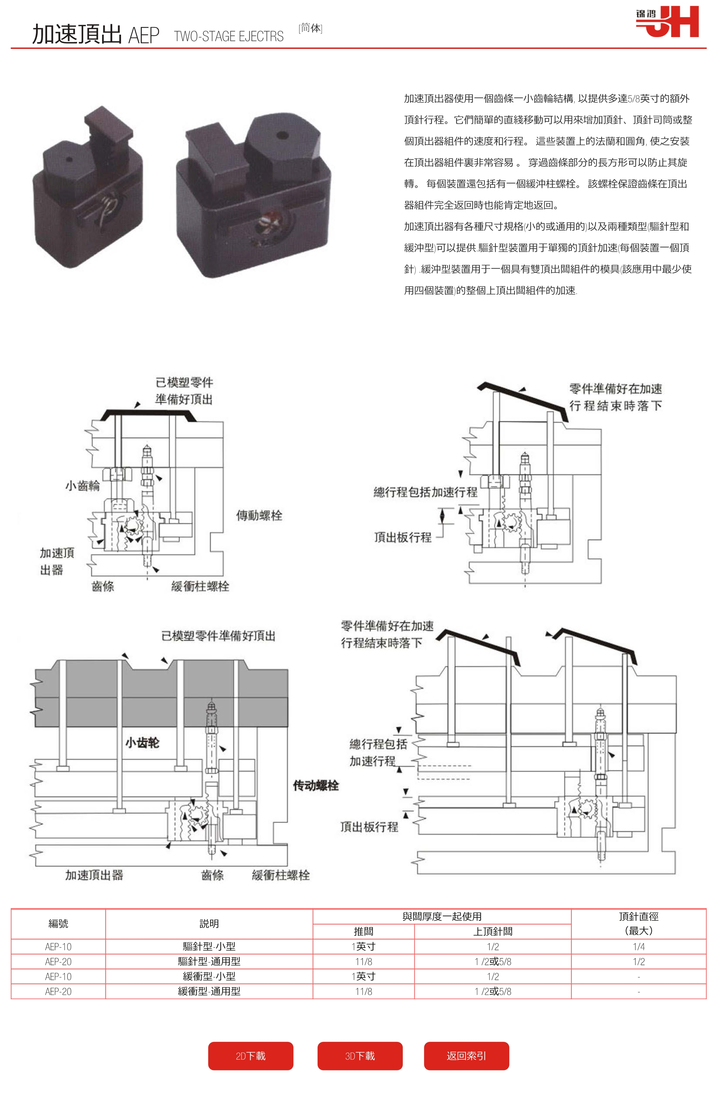 加速頂出器使用一個(gè)齒條一小齒輪結(jié)構(gòu), 以提供多達(dá)5/8英寸的額外頂針行程。它們簡(jiǎn)單的直綫移動(dòng)可以用來(lái)增加頂針、頂針?biāo)就不蛘麄€(gè)頂出器組件的速度和行程。 這些裝置上的法蘭和圓角, 使之安裝在頂出器組件裏非常容易 。 穿過(guò)齒條部分的長(zhǎng)方形可以防止其旋轉(zhuǎn)。 每個(gè)裝置還包括有一個(gè)緩沖柱螺栓。 該螺栓保證齒條在頂出器組件完全返回時(shí)也能肯定地返回。