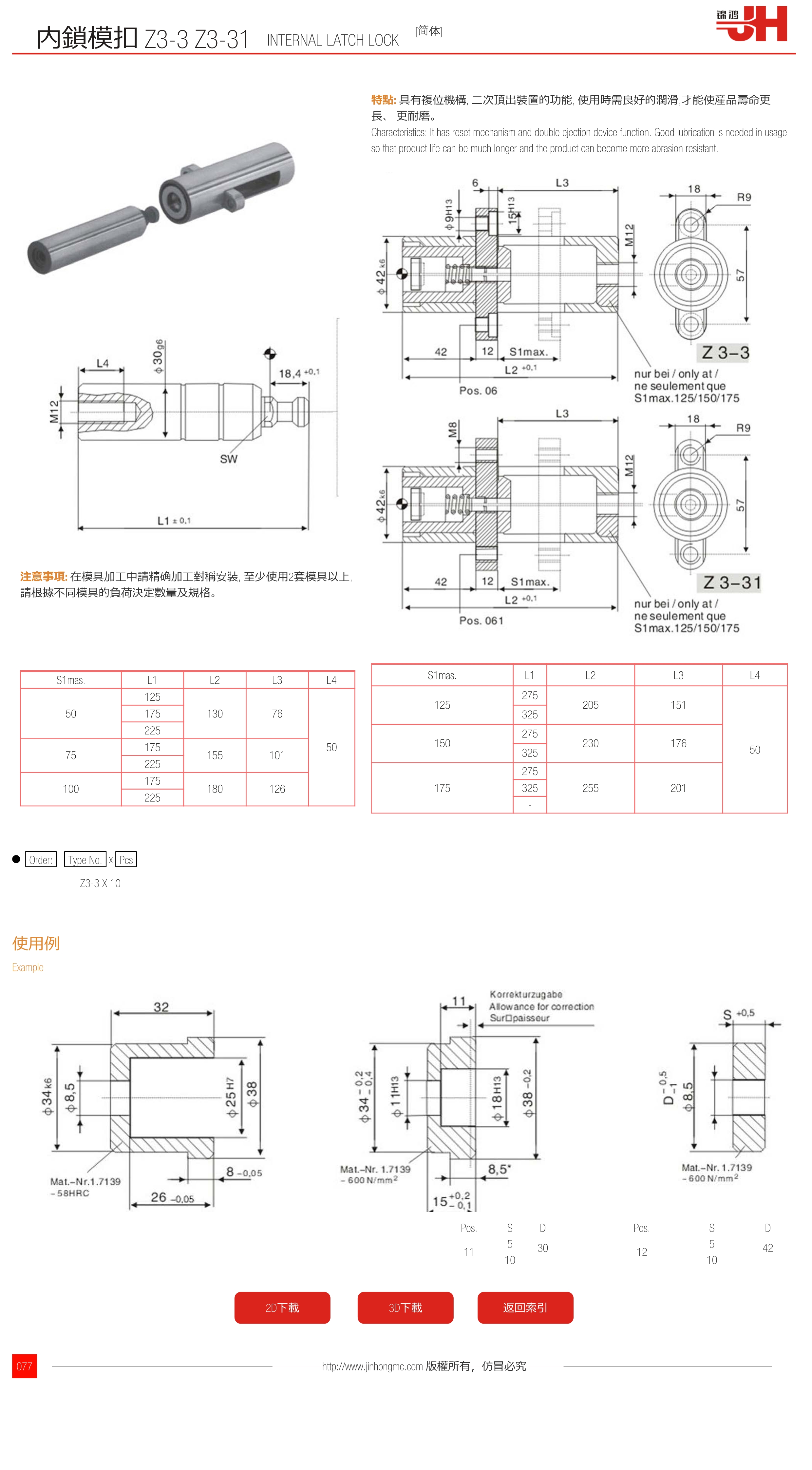 注意事項(xiàng): 在模具加工中請精確加工對稱安裝, 至少使用2套模具以上, 請根據(jù)不同模具的負(fù)荷決定數(shù)量及規(guī)格。 | 特點(diǎn): 具有複位機(jī)構(gòu), 二次頂出裝置的功能, 使用時(shí)需良好的潤滑,才能使産品壽命更長、 更耐磨。 | ||||||||||||||||||||||||||||||||||||||||||||