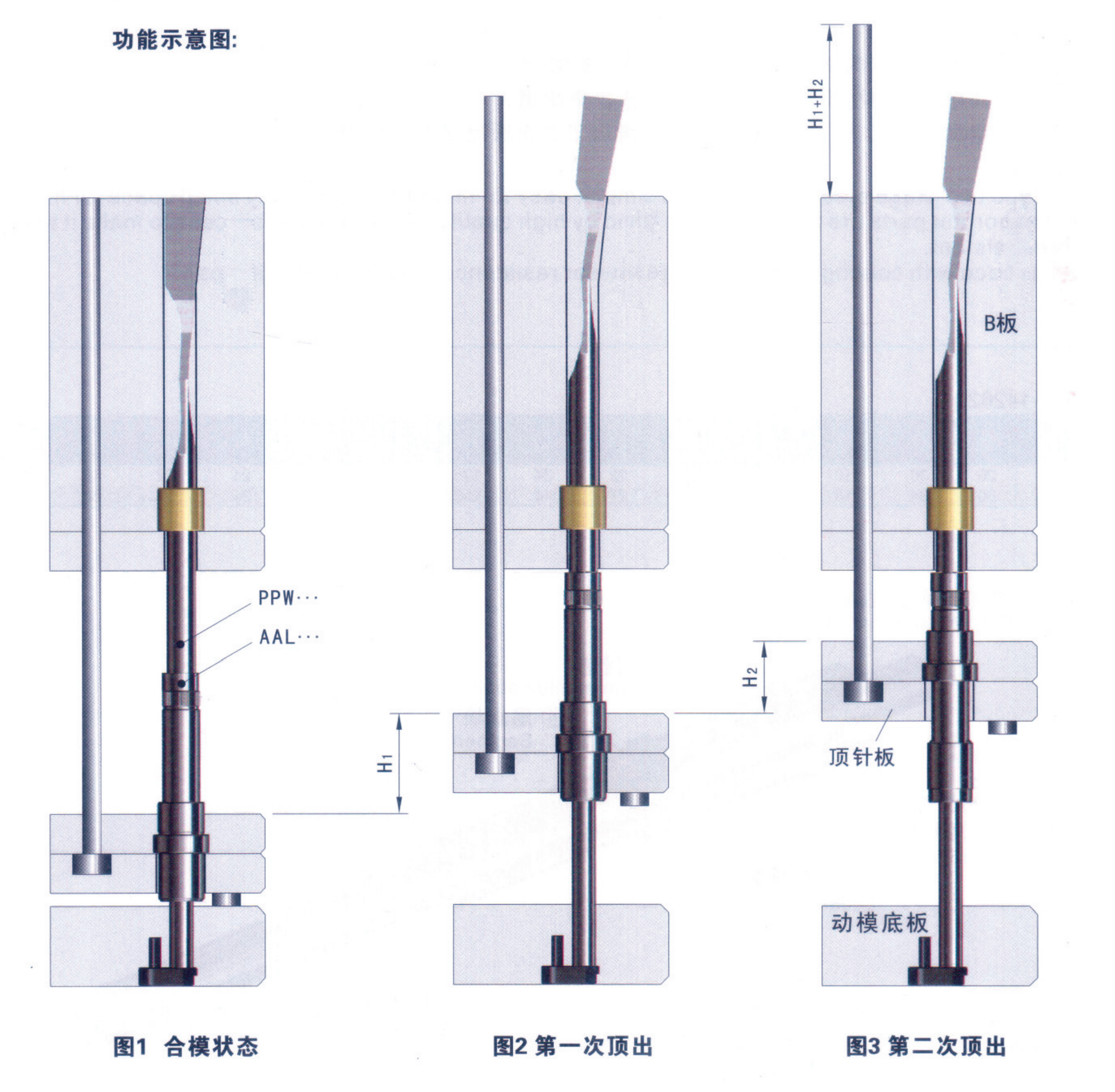 安裝頂桿,在所有步驟安裝前先精確計(jì)算好需要的行程然后截取頂桿長(zhǎng)度并加工連接槽, 通過(guò)墊塊固定在動(dòng)模底板上;