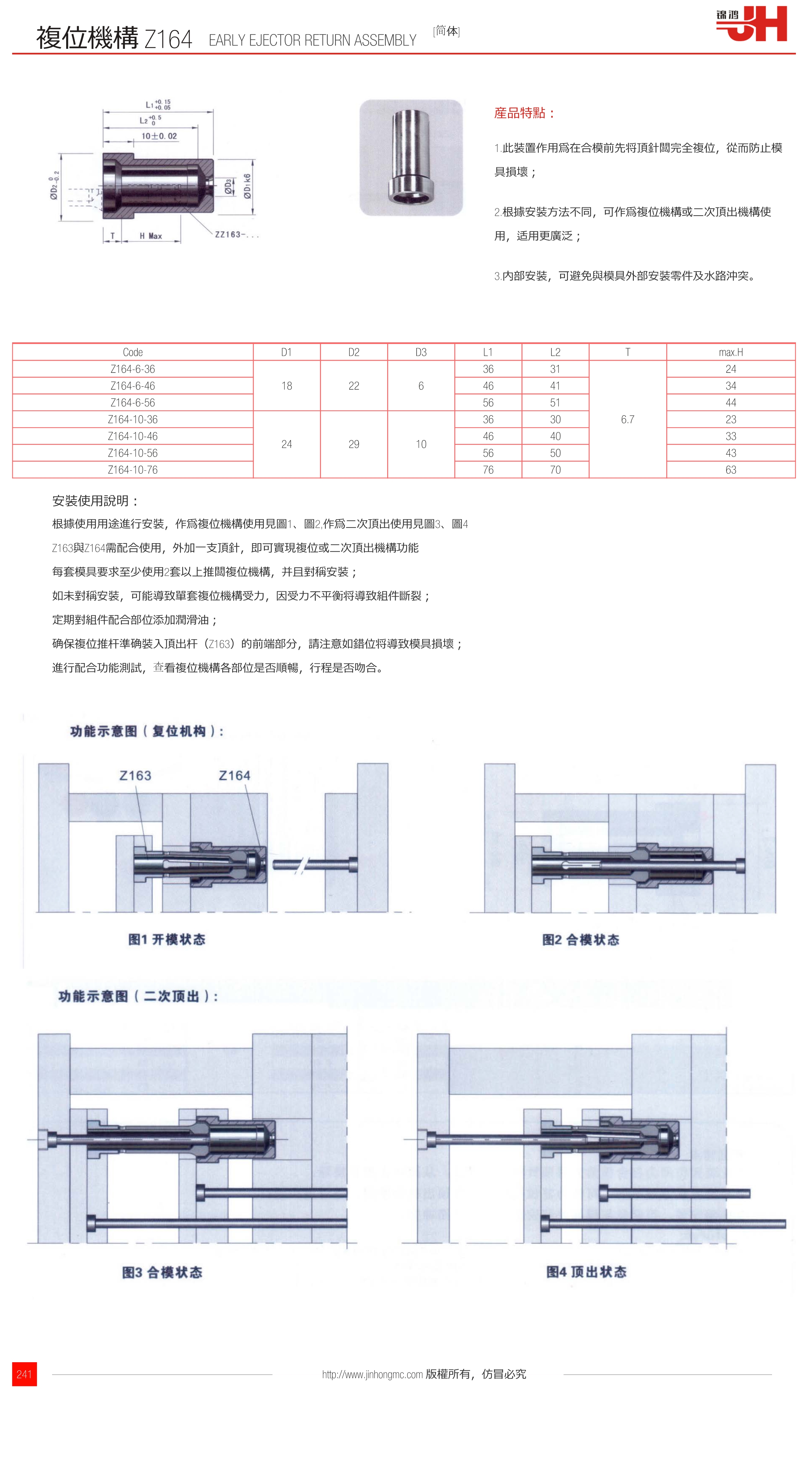 Z163與Z164需配合使用,外加一支頂針,即可實(shí)現(xiàn)復(fù)位或二次頂出機(jī)構(gòu)功能