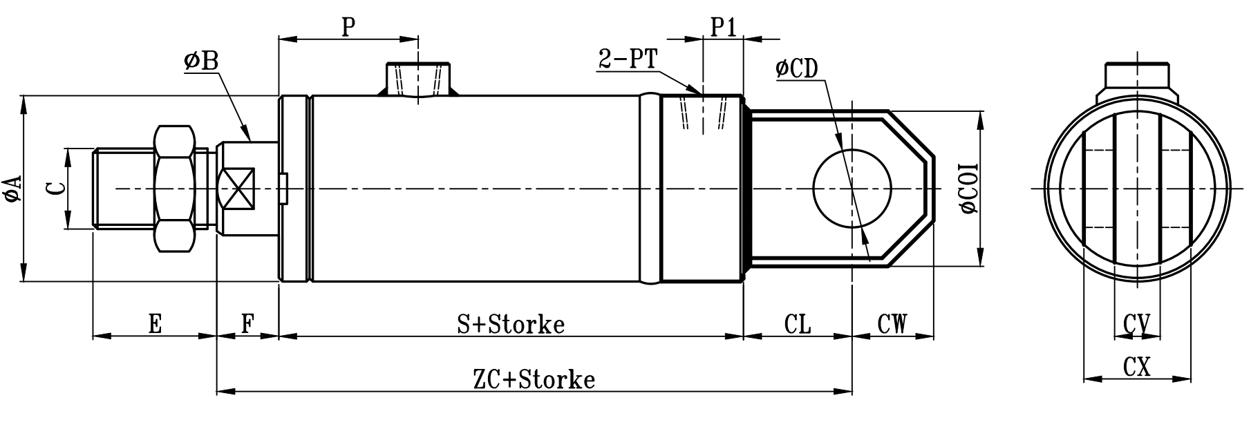 缸徑 BORE | ΦA(chǔ) | ΦB | C | E | F | P | P1 | PT | S | ZC | ΦCD | ΦCO | ΦCOI | CL | CW | CV | CX |