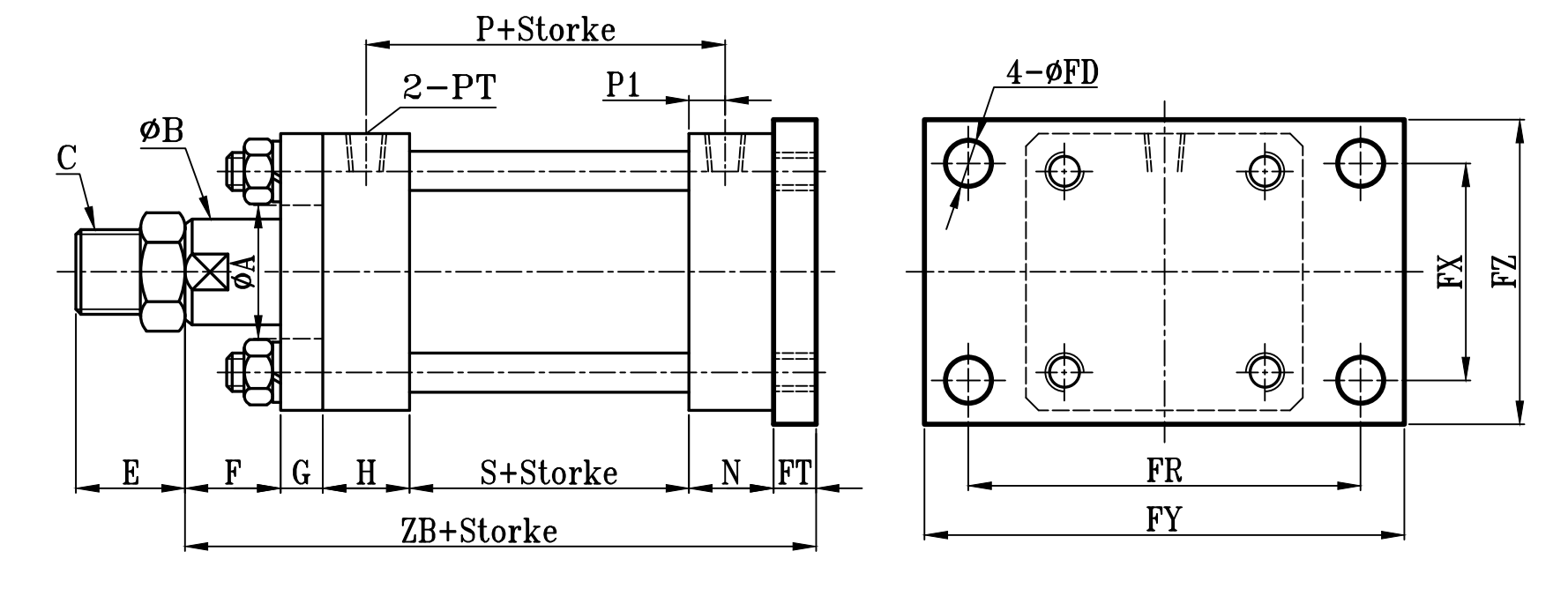 缸徑 BORE | ΦA(chǔ) | ΦB | C | E | F | G | H | N | P | P1 | PT | S | ZB | ZD | ΦFD | FT | FR | FX | FY | FZ |