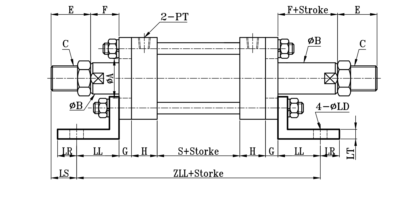 缸徑 BORE | ΦA(chǔ) | ΦB | C | E | F | G | H | N | P | P1 | PT | S | LS | ZL | ZLL | ΦLD | LH | LN | LL | LR | LT | LX | LY |