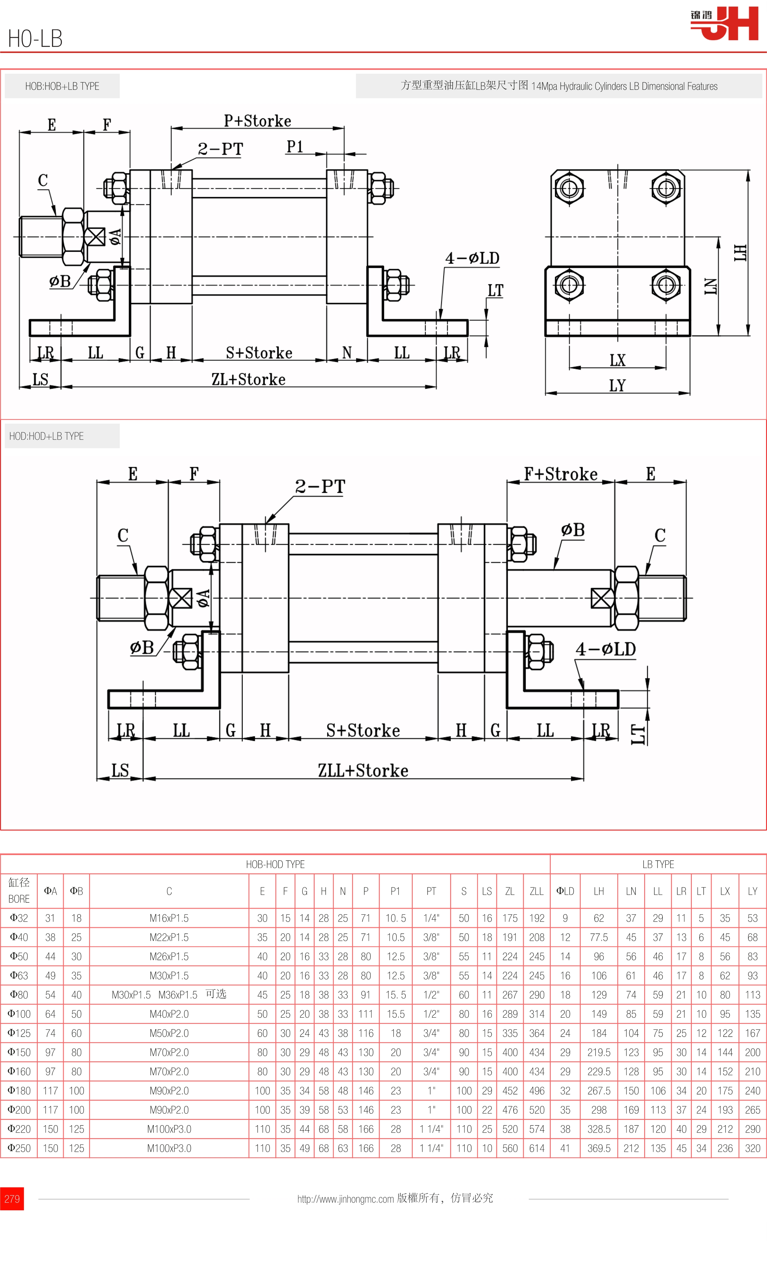 HOB:HOB+LB TYPE | 方型重型油壓缸LB架尺寸圖 14Mpa Hydraulic Cylinders LB Dimensional Features |