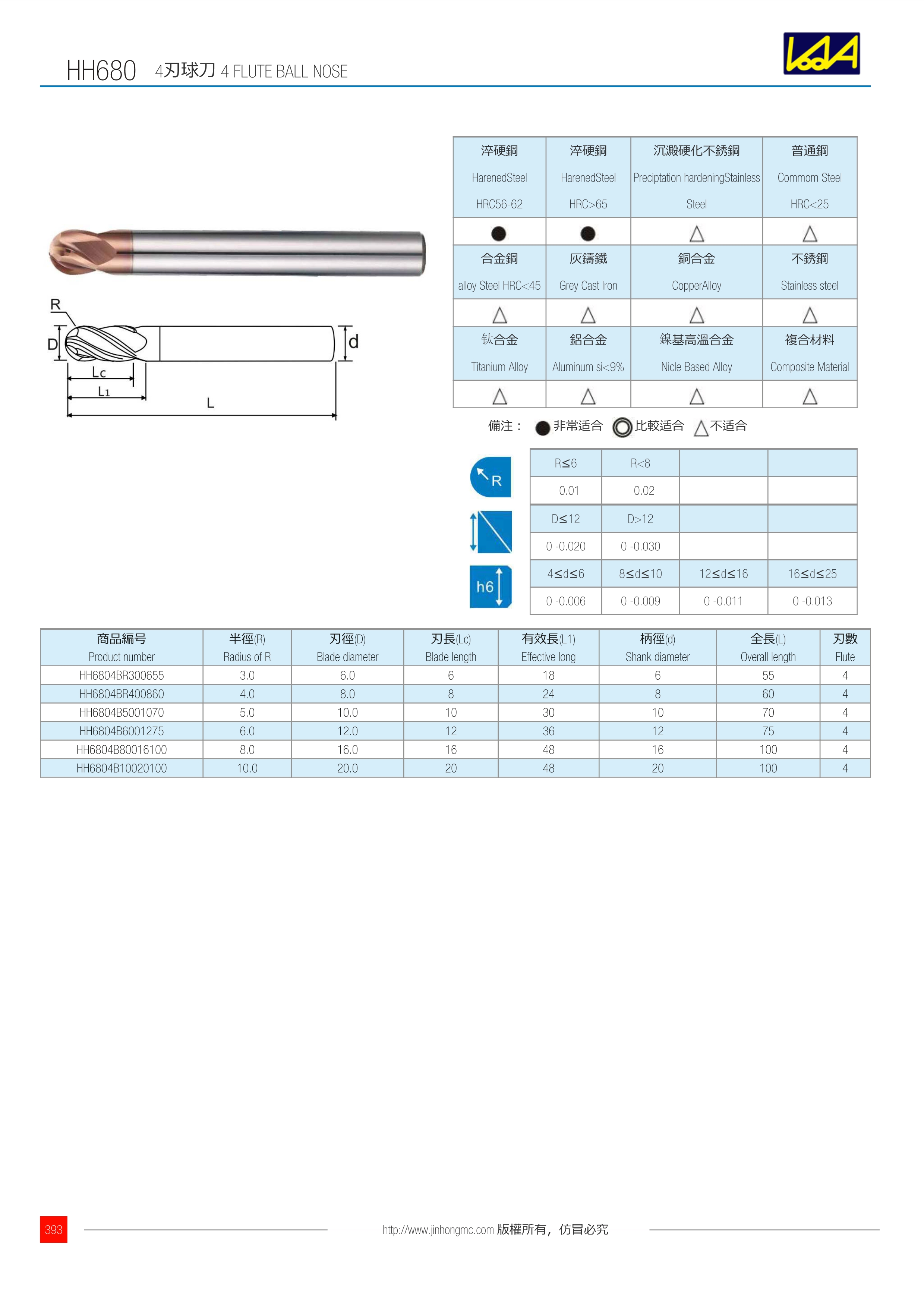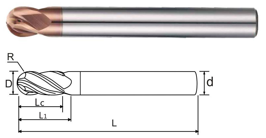 商品編號 Product number | 半徑(R) Radius of R | 刃徑(D) Blade diameter | 刃長(Lc) Blade length | 有效長(L1) Effective long | 柄徑(d) Shank diameter | 全長(L) Overall length | 刃數(shù) Flute |
