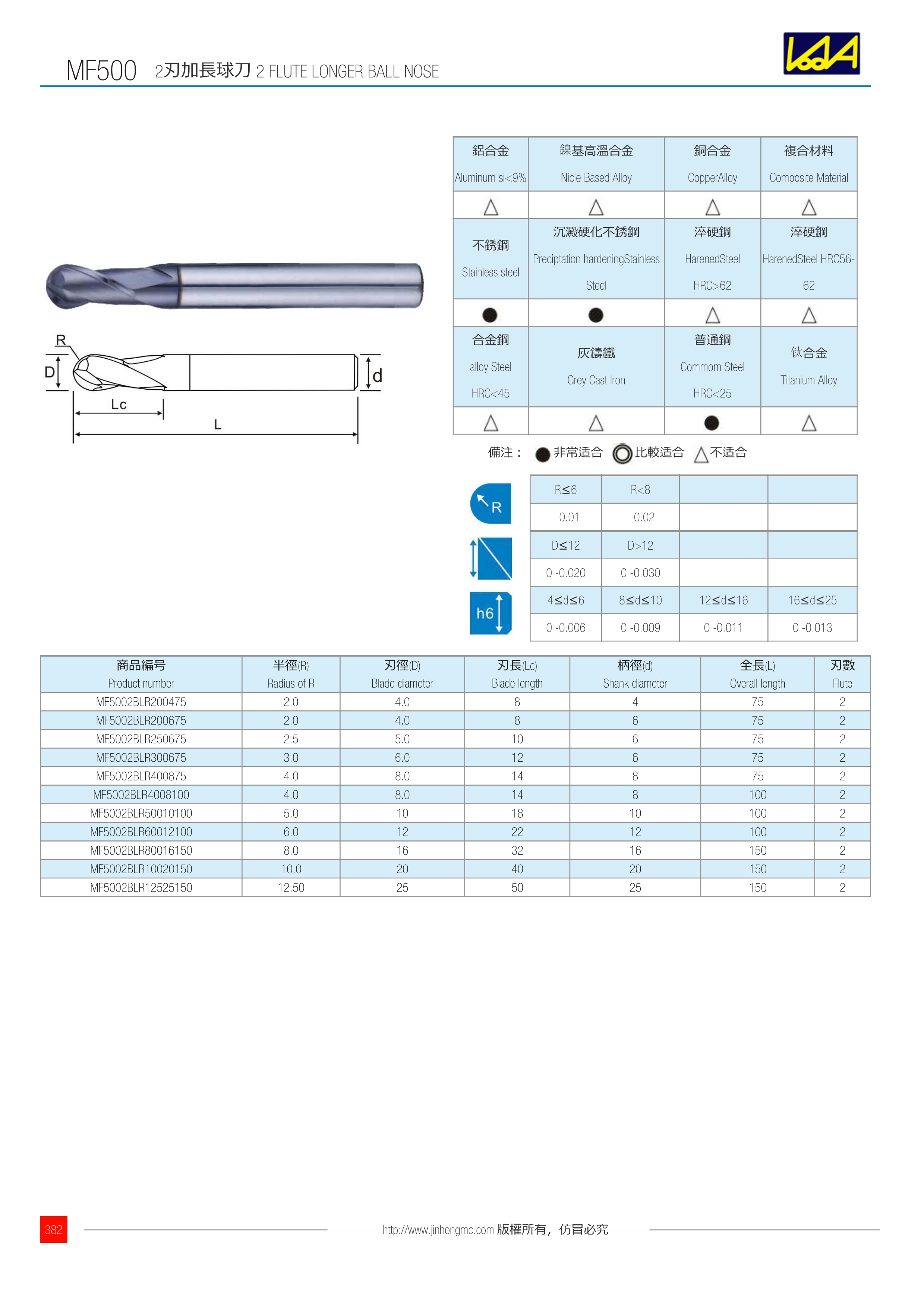 商品編號(hào) Product number | 半徑(R) Radius of R | 刃徑(D) Blade diameter | 刃長(zhǎng)(Lc) Blade length | 柄徑(d) Shank diameter | 全長(zhǎng)(L) Overall length | 刃數(shù) Flute |