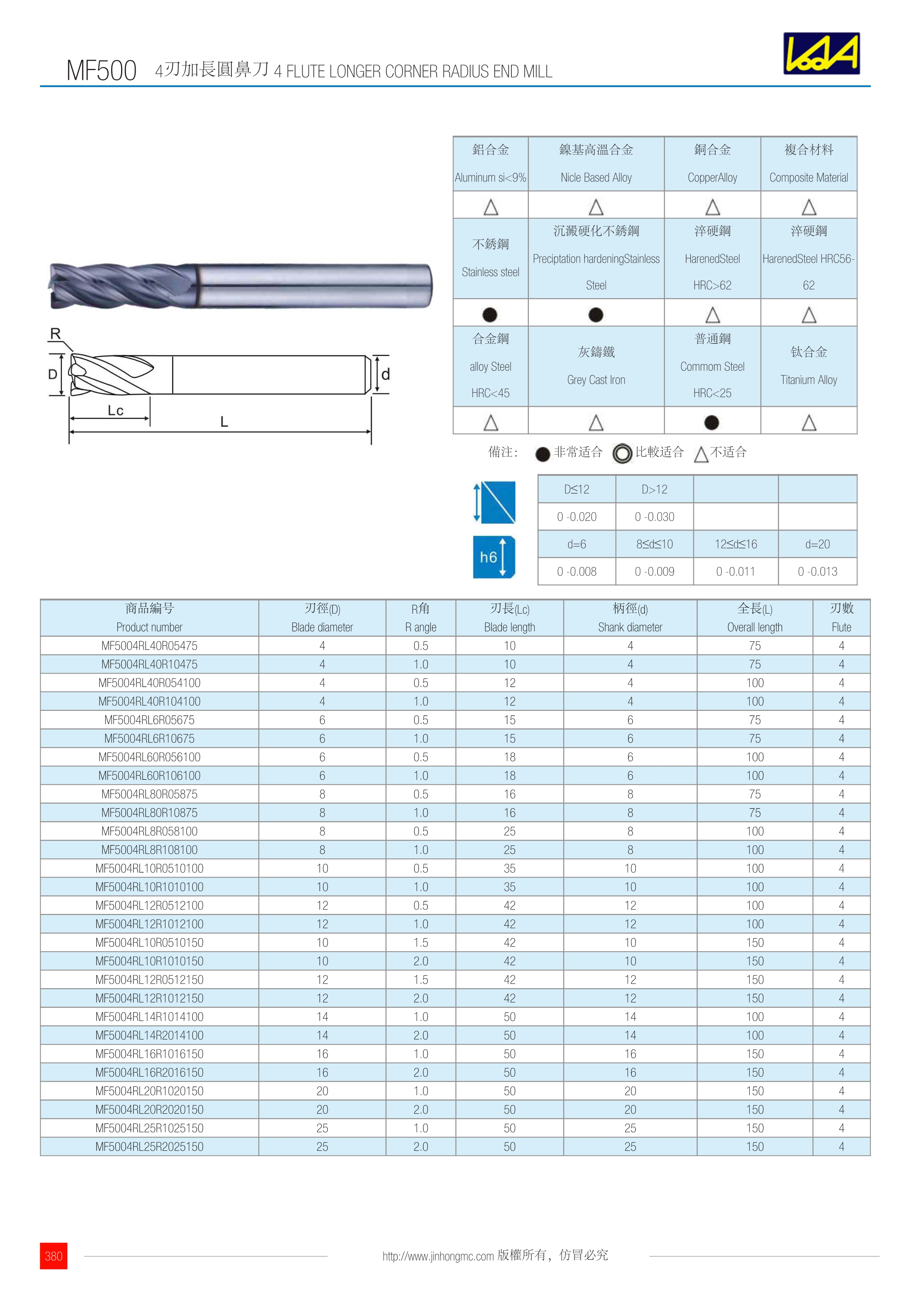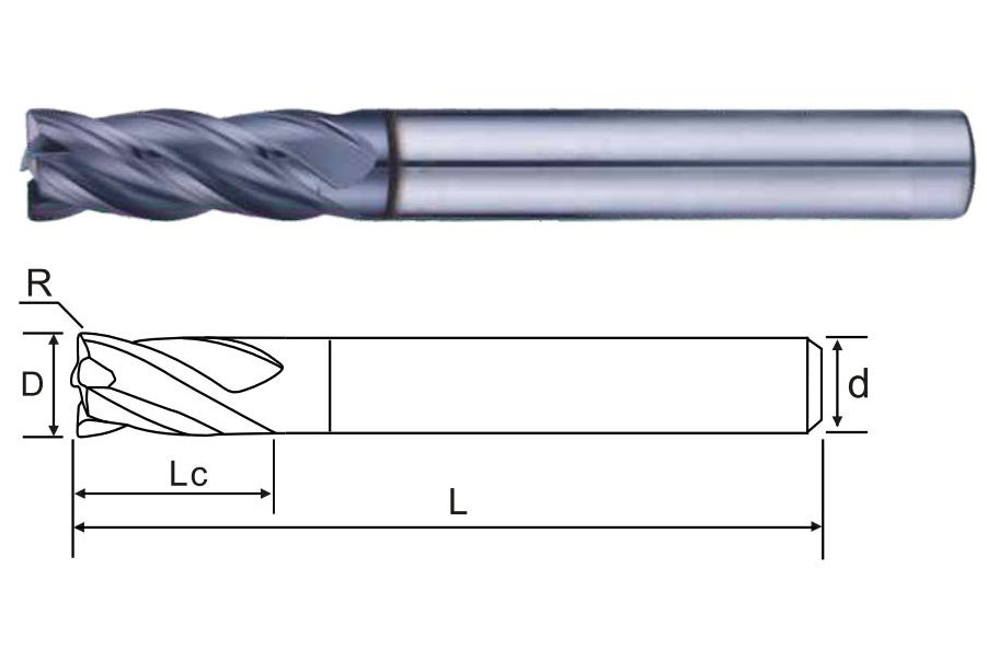 商品編號 Product number | 刃徑(D) Blade diameter | R角 R angle | 刃長(Lc) Blade length | 柄徑(d) Shank diameter | 全長(L) Overall length | 刃數(shù) Flute |