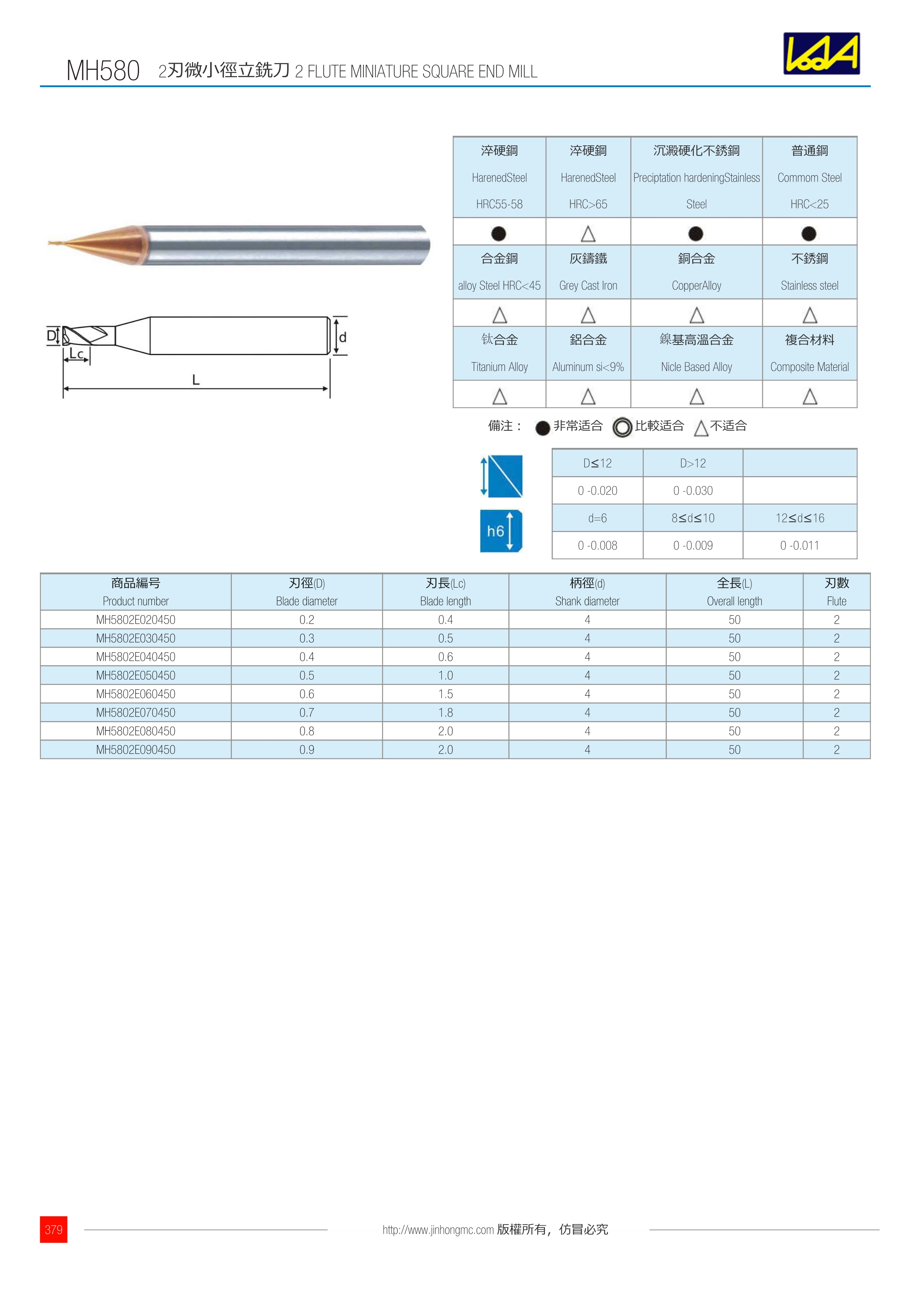 商品編號 Product number | 刃徑(D) Blade diameter | 刃長(Lc) Blade length | 柄徑(d) Shank diameter | 全長(L) Overall length | 刃數(shù) Flute |