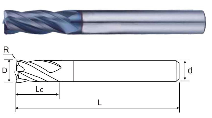 商品編號 Product number | 刃徑(D) Blade diameter | R 角(R) R angle | 刃長(Lc) Blade length | 柄徑(d) Shank diameter | 全長(L) Overall length | 刃數(shù) Flute |
