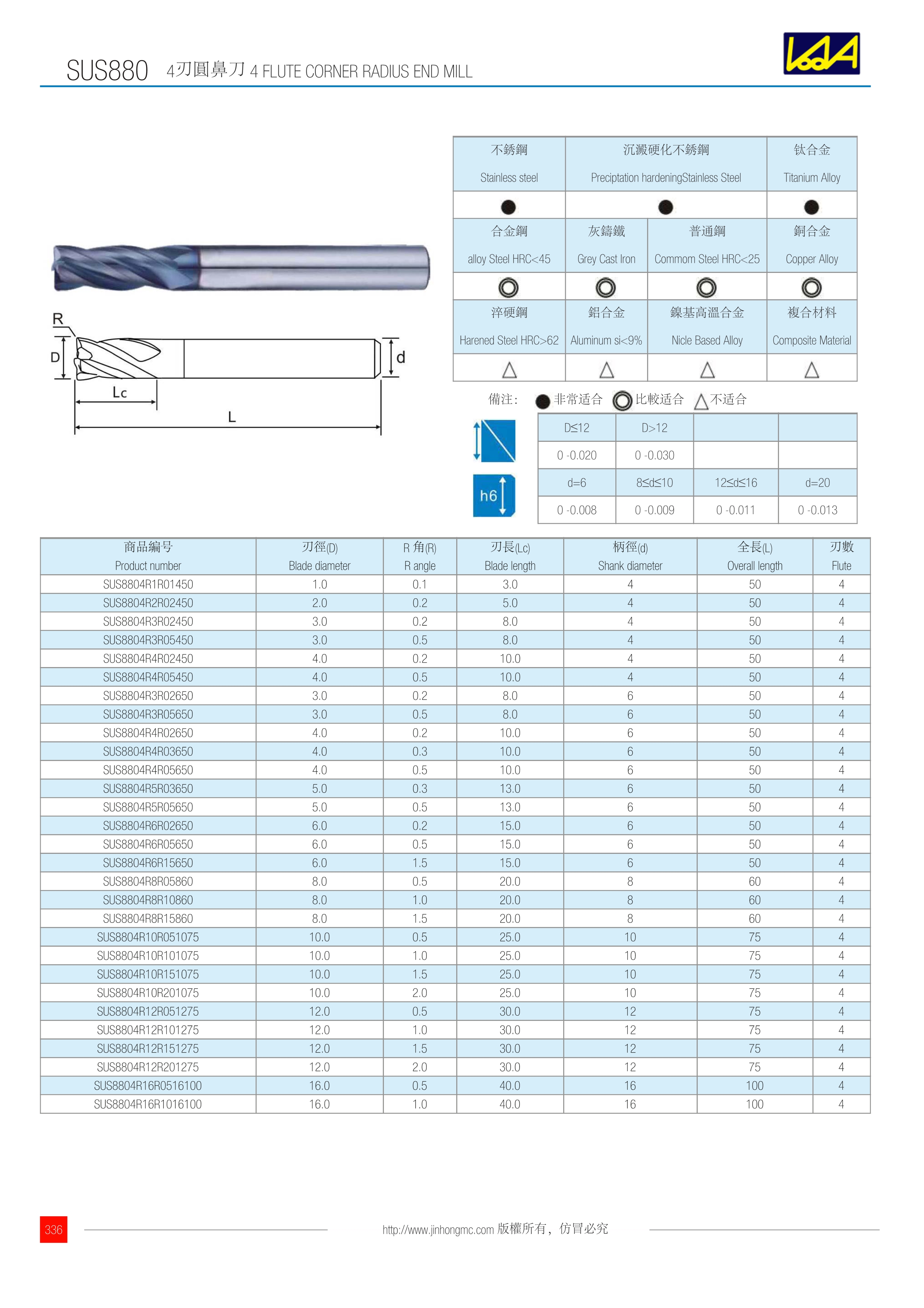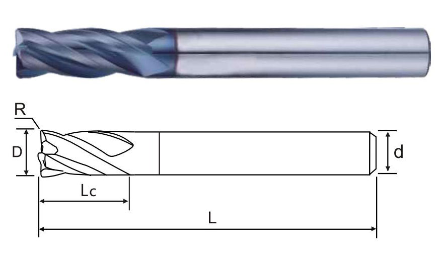 商品編號 Product number | 刃徑(D) Blade diameter | R 角(R) R angle | 刃長(Lc) Blade length | 柄徑(d) Shank diameter | 全長(L) Overall length | 刃數(shù) Flute |