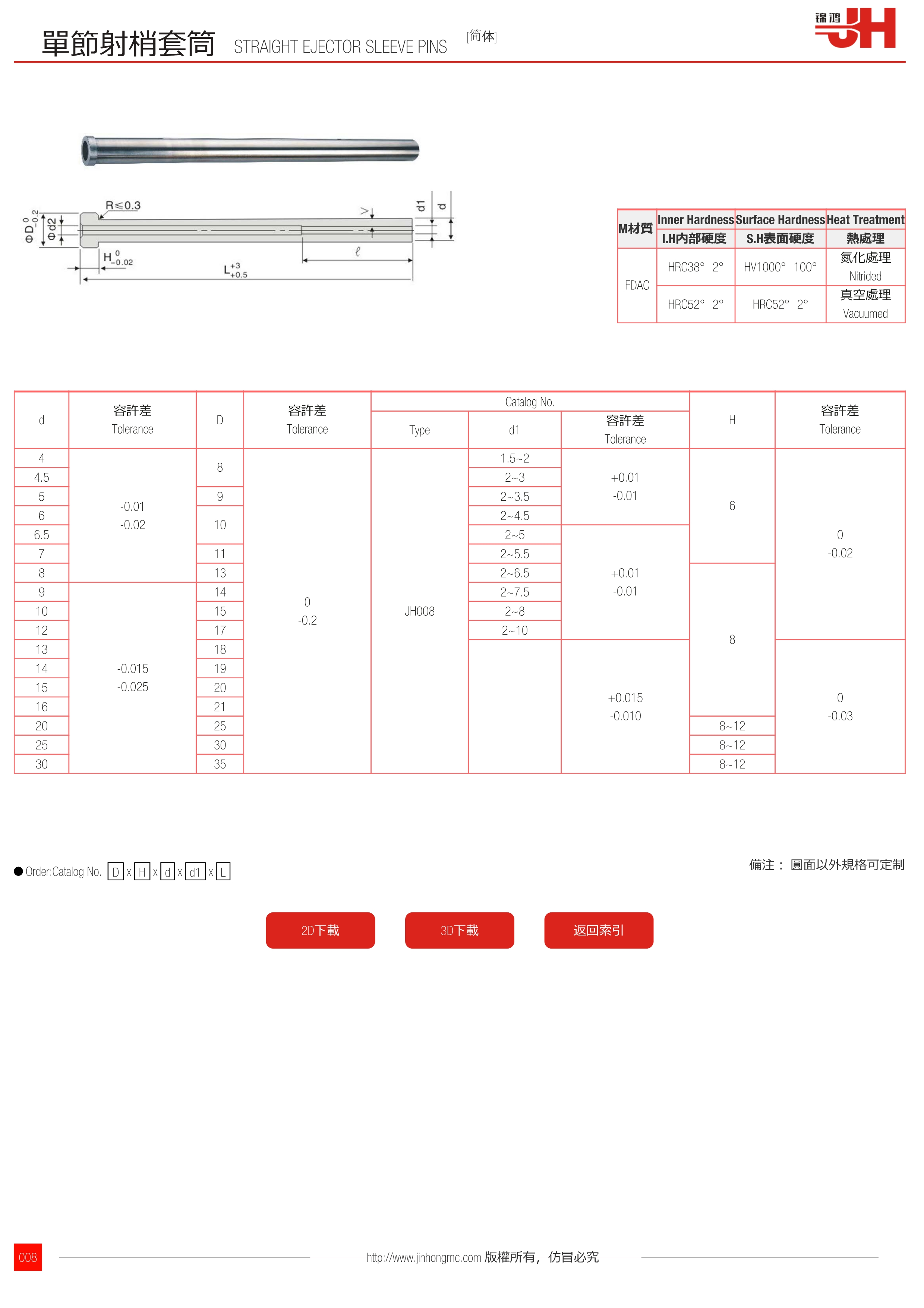 4 | -0.01 -0.02 | 8 | 0 -0.2 | JH008 | 1.5~2 | +0.01 -0.01 | 6 | 0 -0.02 |