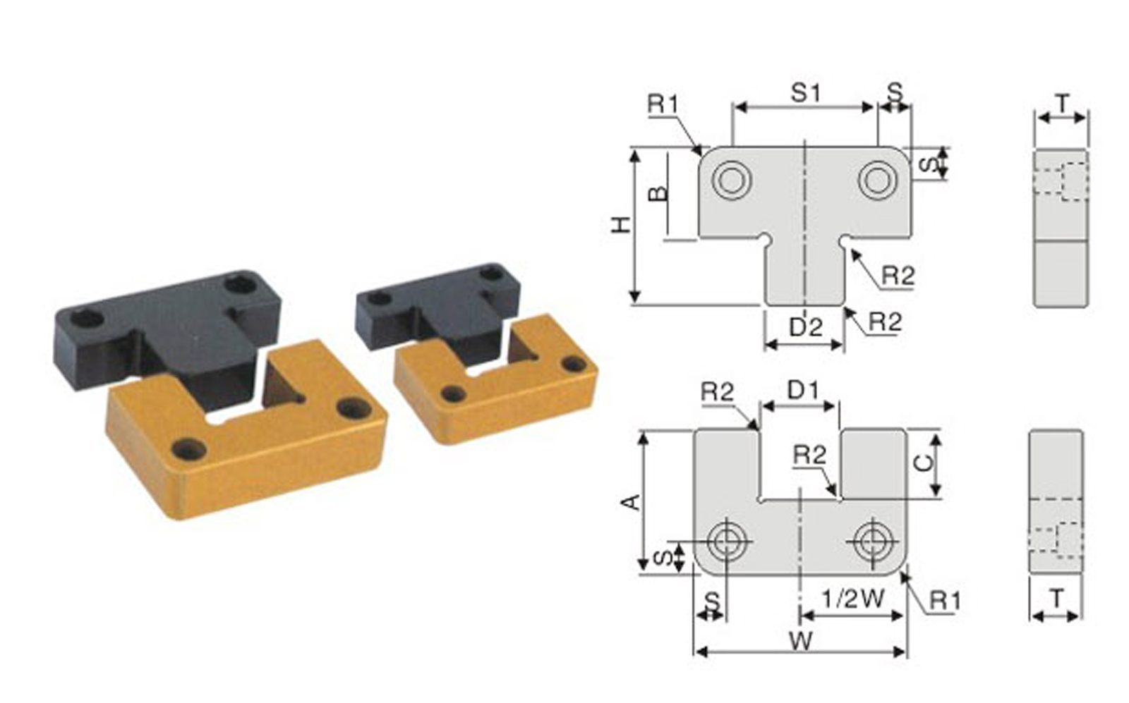 Type | W ±0.001 | T ±0.001 | A ±0.001 | B ±0.001 | C | D1 ±0.0003 0 | D2 0 -0.0003 | H | R1 | POCKET RADIUS | R2 | S ±0.010 | S1 ±0.010 | SHCS |