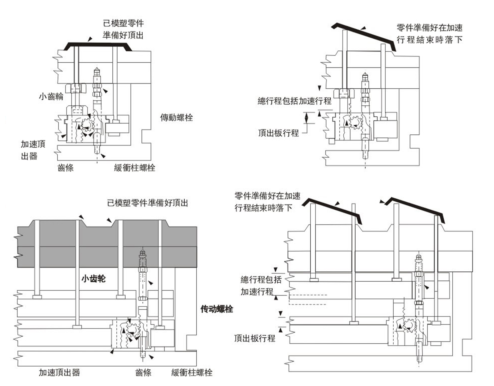 加速頂出器使用一個(gè)齒條一小齒輪結(jié)構(gòu), 以提供多達(dá)5/8英寸的額外頂針行程。它們簡(jiǎn)單的直綫移動(dòng)可以用來(lái)增加頂針、頂針?biāo)就不蛘麄€(gè)頂出器組件的速度和行程。 這些裝置上的法蘭和圓角, 使之安裝在頂出器組件裏非常容易 。 穿過(guò)齒條部分的長(zhǎng)方形可以防止其旋轉(zhuǎn)。 每個(gè)裝置還包括有一個(gè)緩沖柱螺栓。 該螺栓保證齒條在頂出器組件完全返回時(shí)也能肯定地返回。