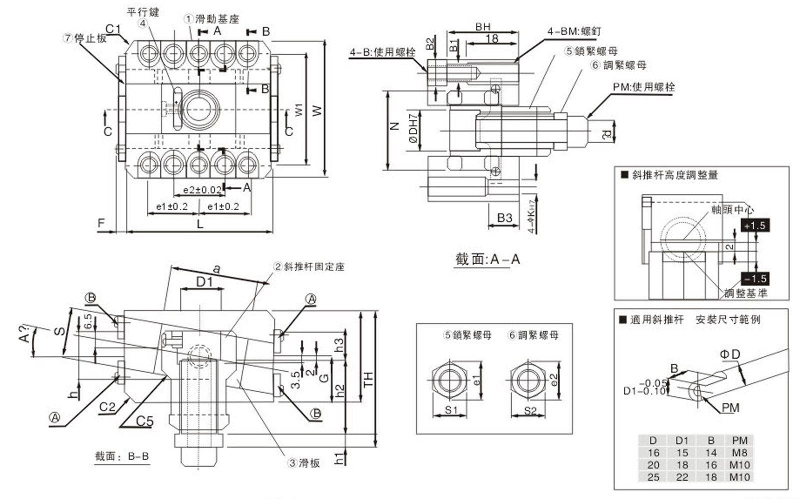 Catalog No. | 安裝孔尺寸 | ⑤鎖緊螺母 | ⑥調(diào)整螺母 | 斜推桿安裝尺寸 | ??ㄩ洶惭b位置 | ||||||||||||||