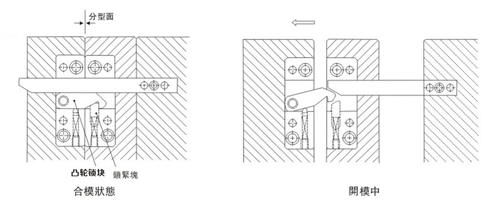 此款産品結(jié)構(gòu)小, 正確開模, 無反作用力。 完全沒有鎖模負載, 可用于低壓鎖模成形 。 其動作與合模順序無關(guān) 。 流道板先于分型面閉合時,鎖緊塊起到後退功能。