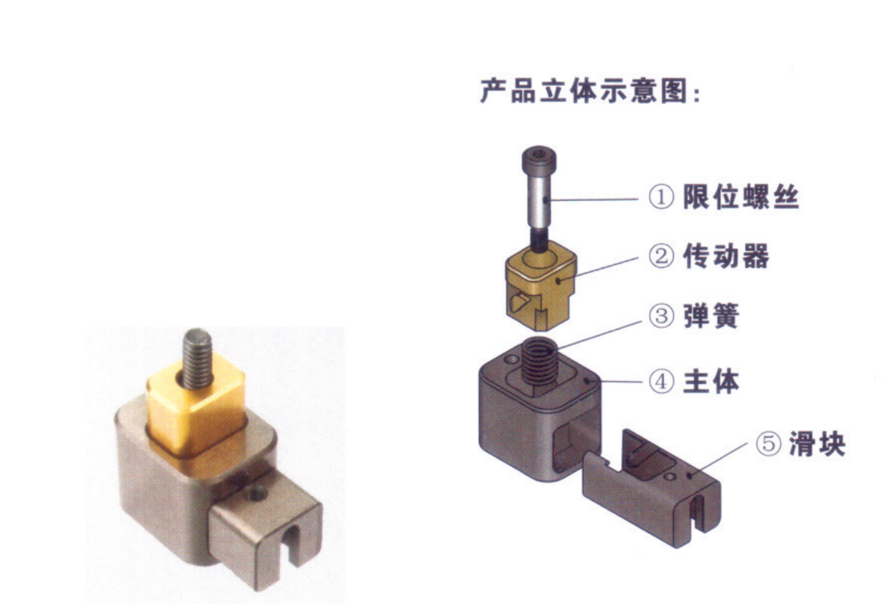 2.主體、滑塊、傳動器、限位螺絲、彈簧為一套組件,無需加工斜導(dǎo)柱孔及 一些繁鎖加工,因此可以降低加工成本及加工時間。