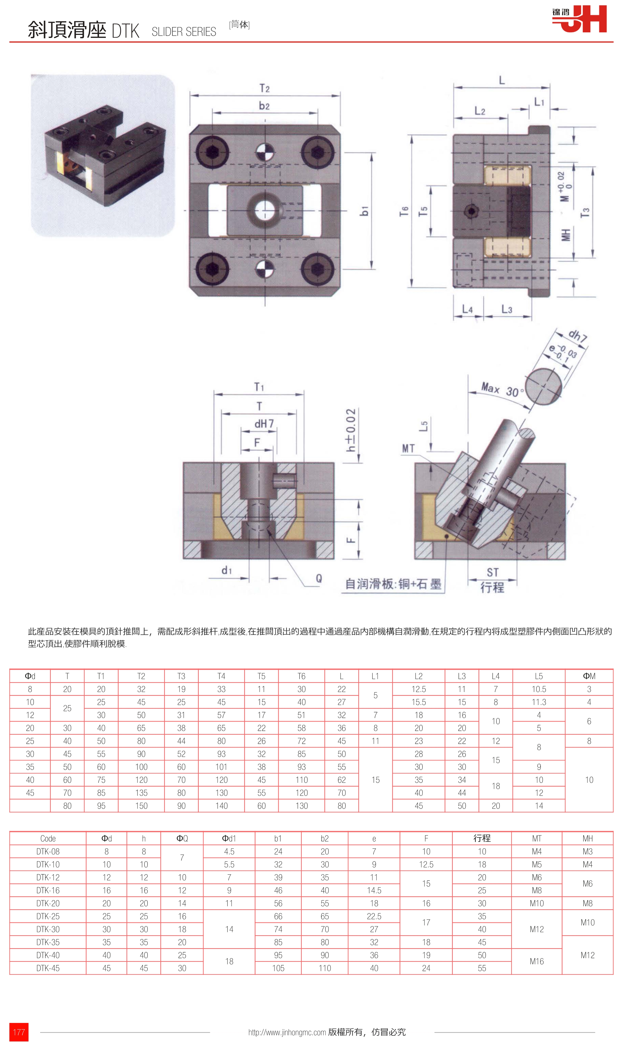 此產(chǎn)品安裝在模具的頂針推板上,需配成形斜推桿,成型后,在推板頂出的過程中通過產(chǎn)品內(nèi)部機(jī)構(gòu)自潤滑動,在規(guī)定的行程內(nèi)將成型塑膠件內(nèi)側(cè)面凹凸形狀的型芯頂出,使膠件順利脫模.