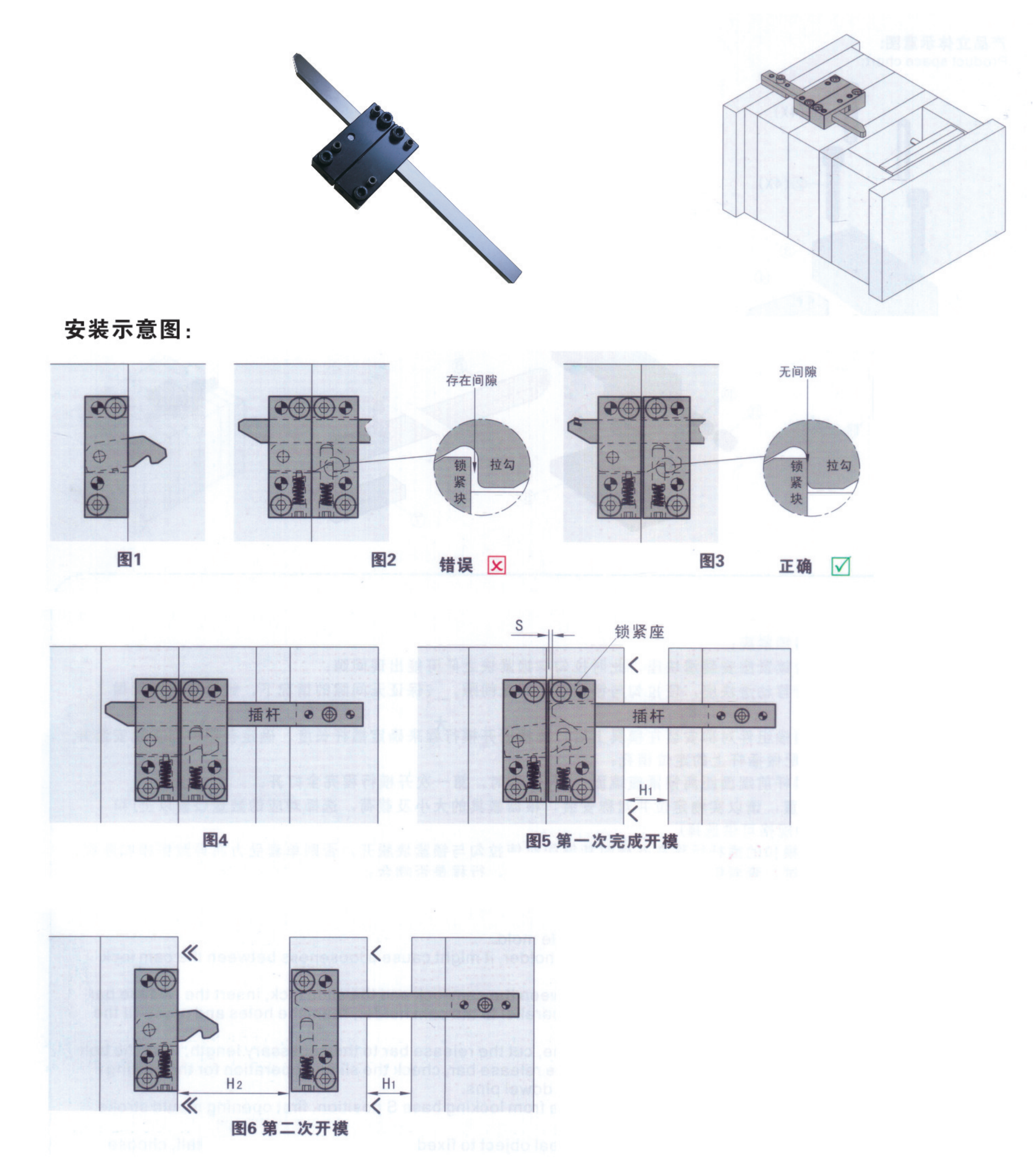 確保所有安裝鎖??鄣牟鍡U行程在開模時能夠同時使拉勾與鎖緊塊脫開,否則單套受力將導(dǎo)致鎖??蹟嗔?;