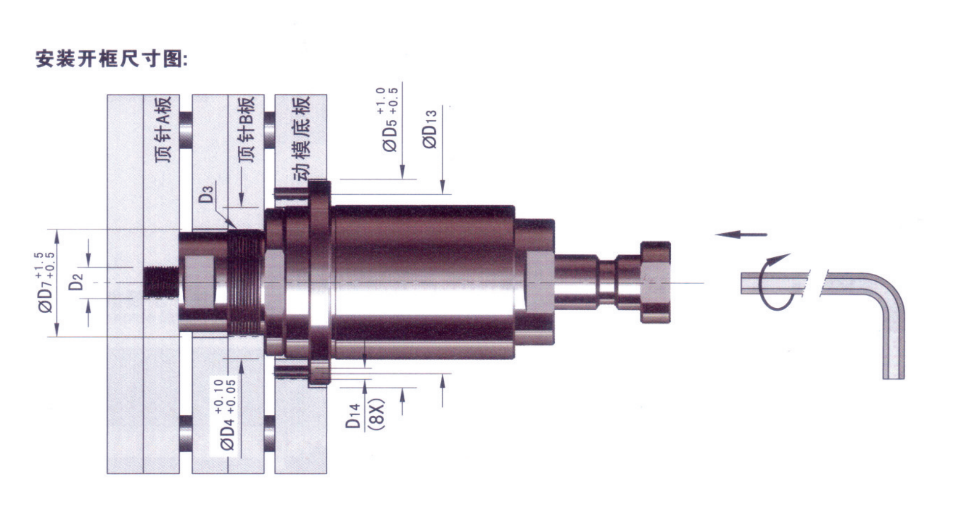 需精準(zhǔn)安裝(一套模具上一般安裝一個頂出裝置);行程要計算準(zhǔn)確,否則產(chǎn)品容易損壞。