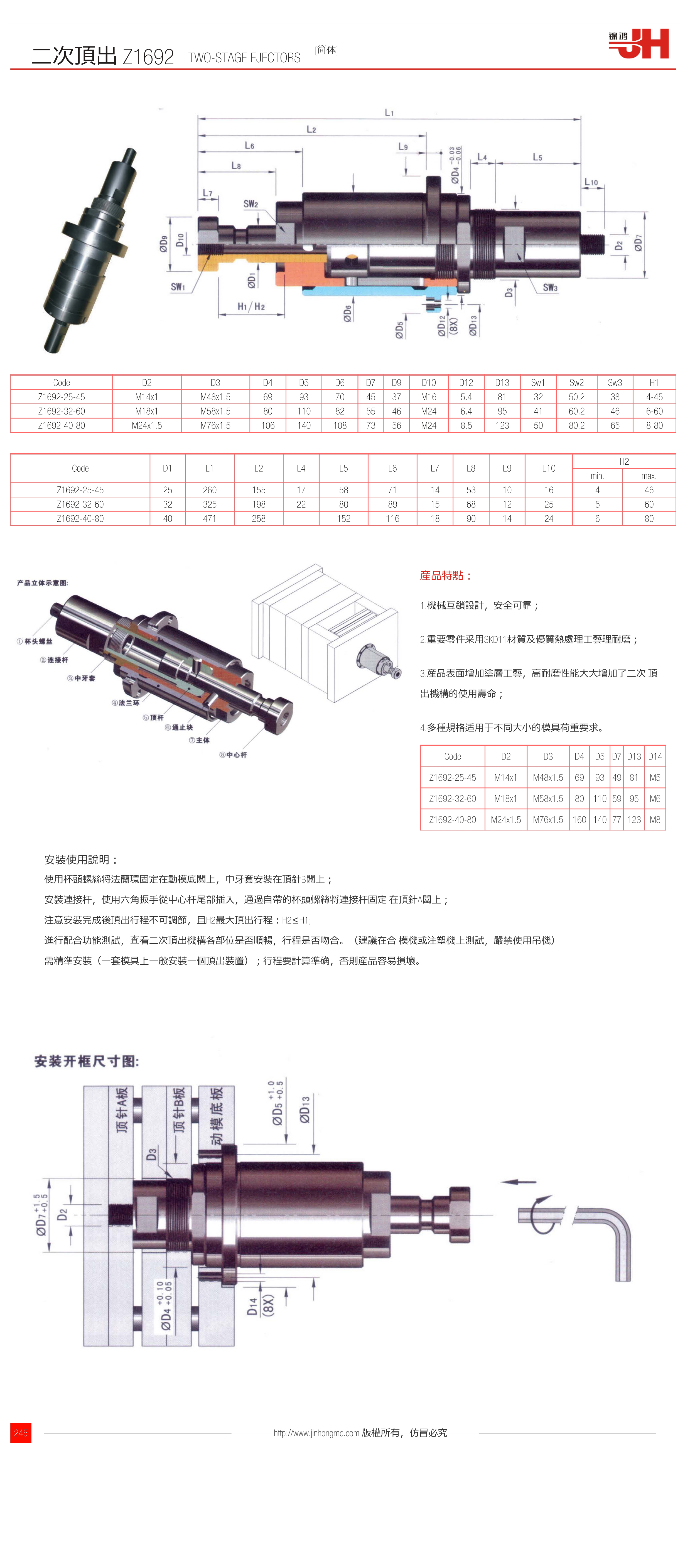 注意安裝完成后頂出行程不可調(diào)節(jié),且H2最大頂出行程:H2≤H1;