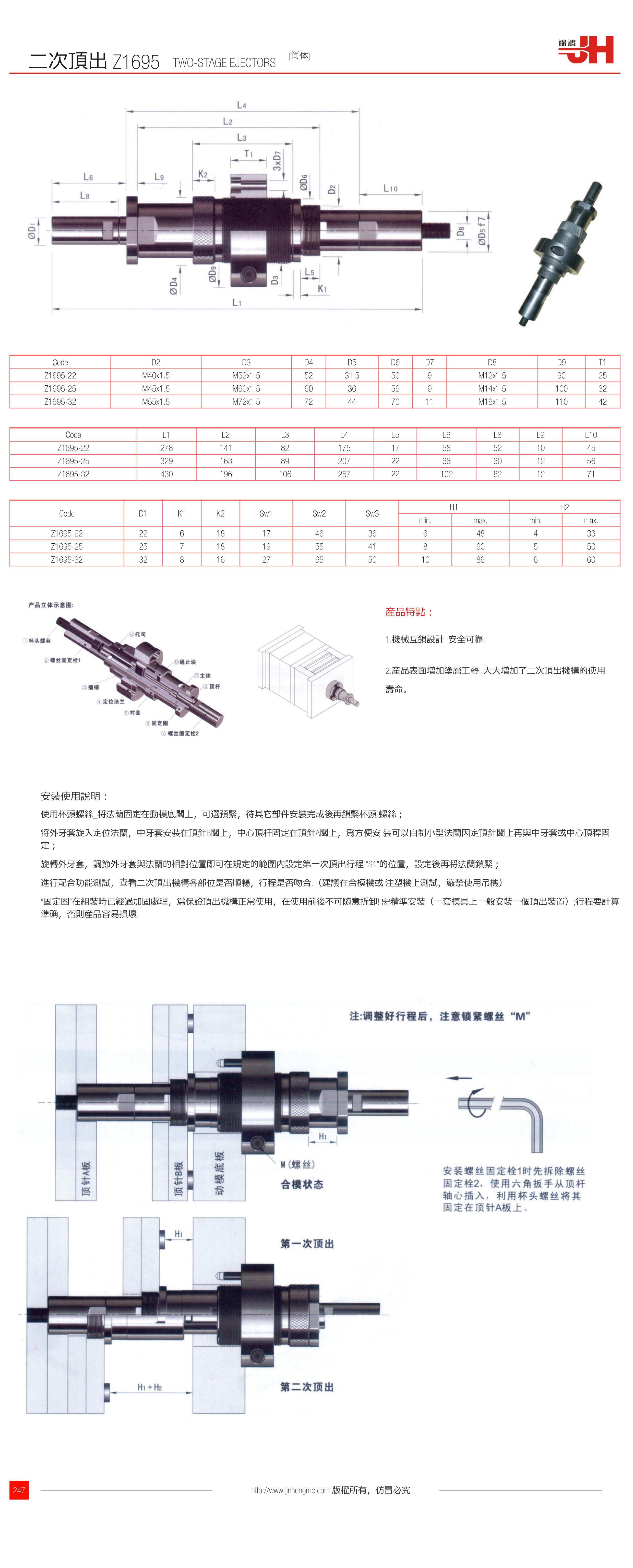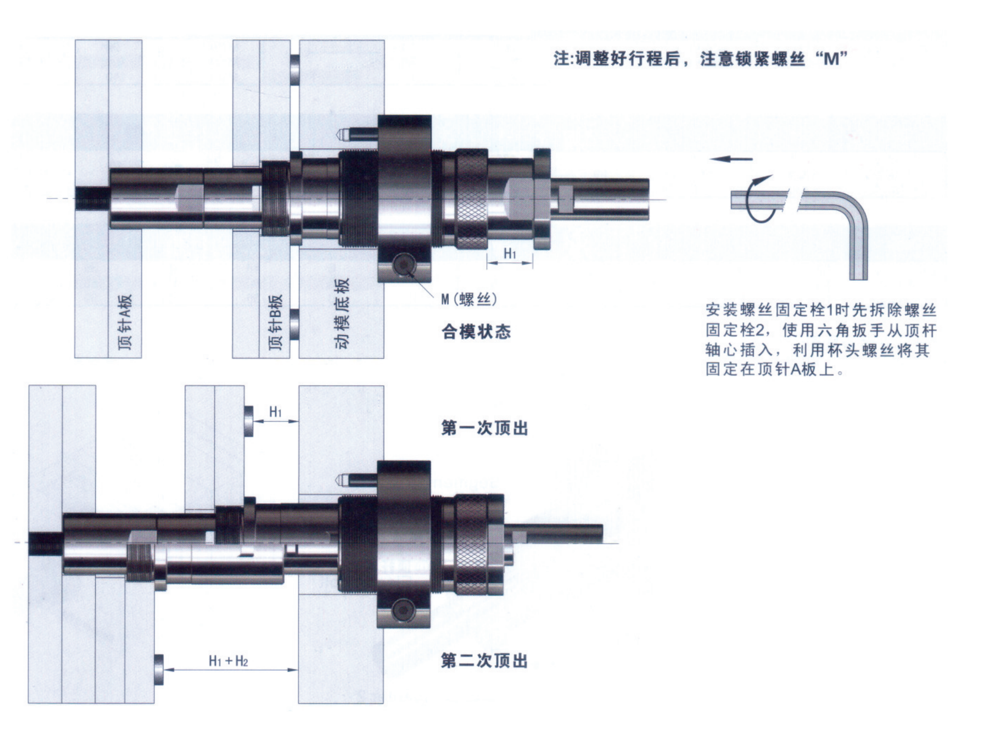 旋轉(zhuǎn)外牙套,調(diào)節(jié)外牙套與法蘭的相對位置即可在規(guī)定的范圍內(nèi)設(shè)定第一次頂出行程 “S1”的位置,設(shè)定后再將法蘭鎖緊;