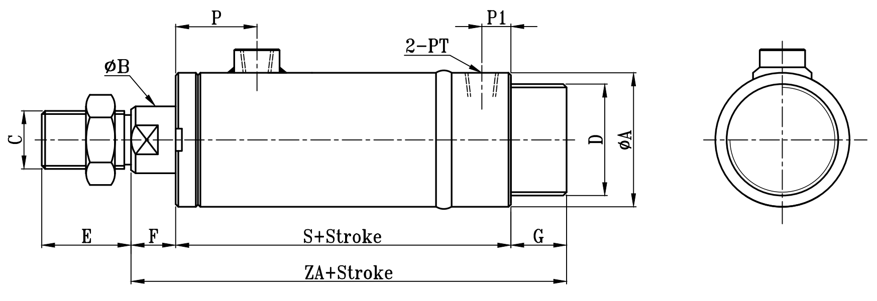 缸徑 BORE | ΦA(chǔ) | ΦB | D | F | G | P | P1 | PT | S | Z | ZA | C | E | J | JH | W | ΦV |