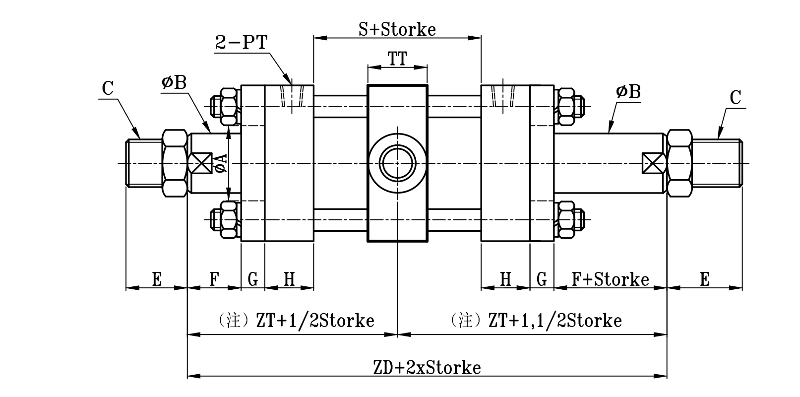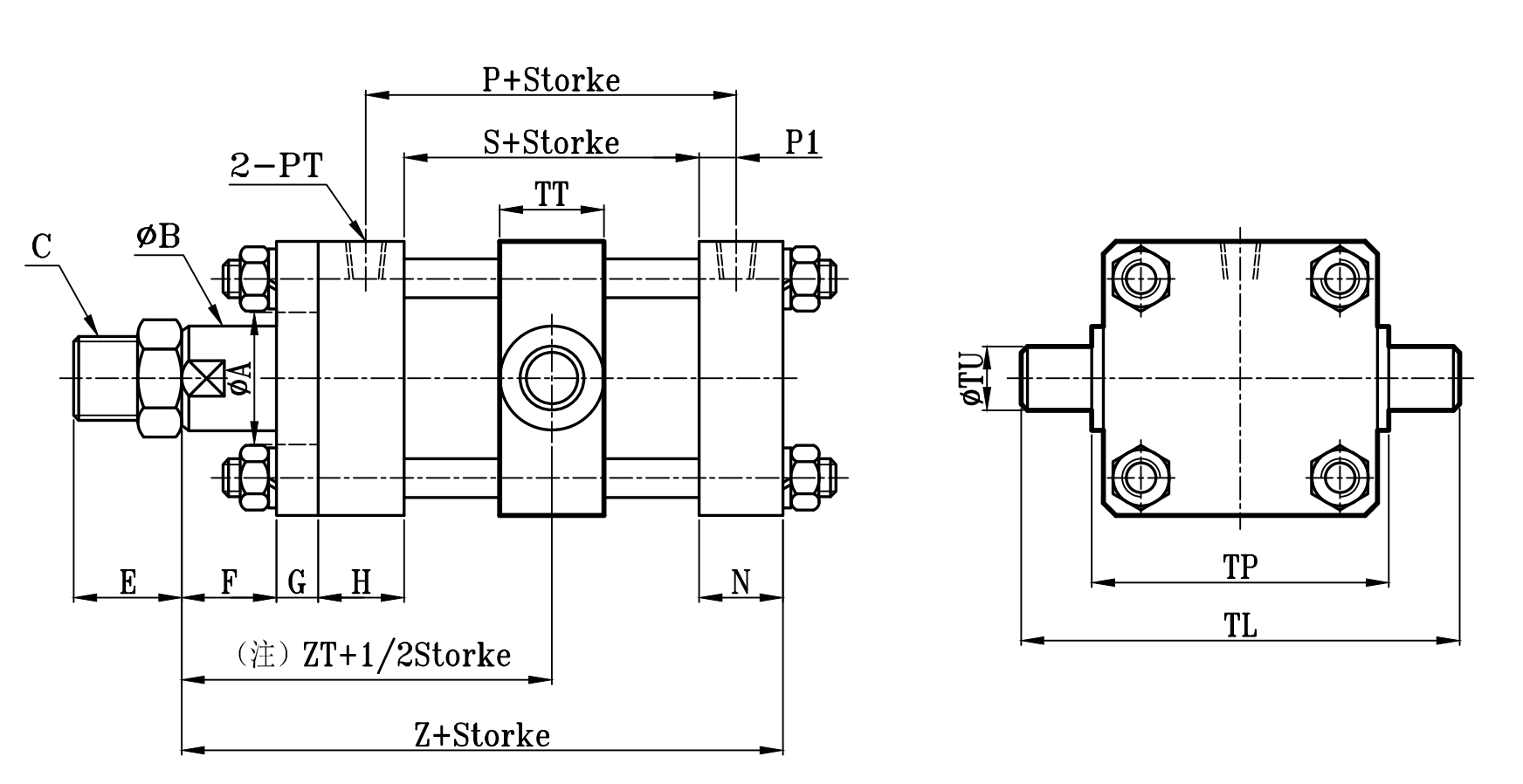 缸徑 BORE | ΦA(chǔ) | ΦB | C | E | F | G | H | N | P | P1 | PT | S | Z | ZD | ZT | ΦTU | TL | TP | TT |