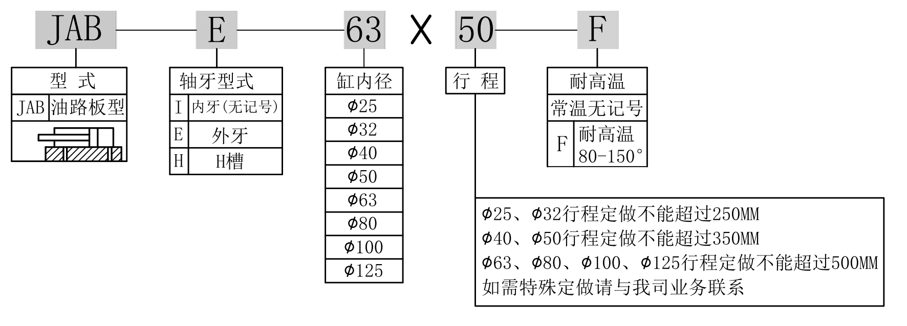 油壓缸內(nèi)徑 Bore sizes of cy linder(mm) | Φ25、Φ32、Φ40、Φ50、Φ63、Φ80、Φ100、Φ125 |