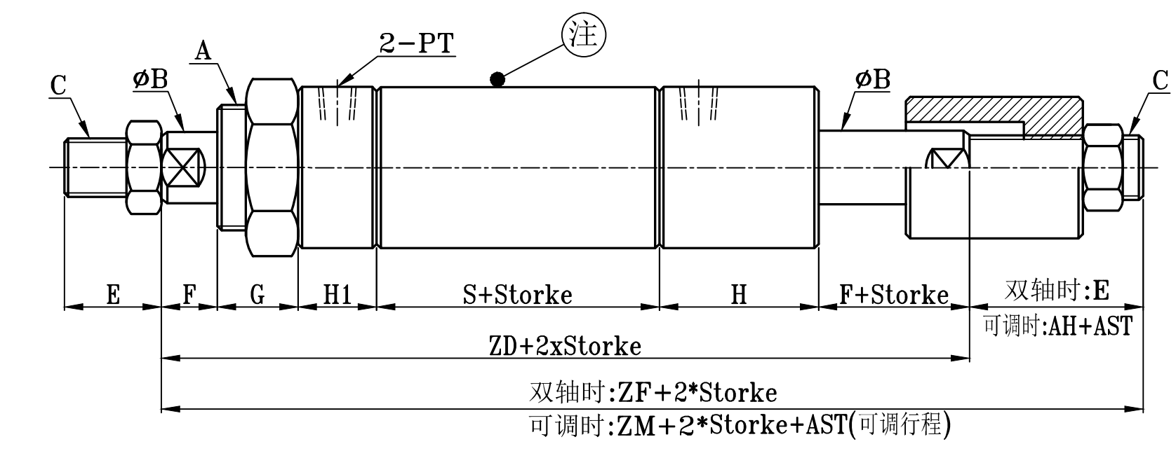 注:感應(yīng)油缸時(shí),不論是單軸還是雙軸缸,缸筒長度的選擇均為雙軸缸的缸筒長度