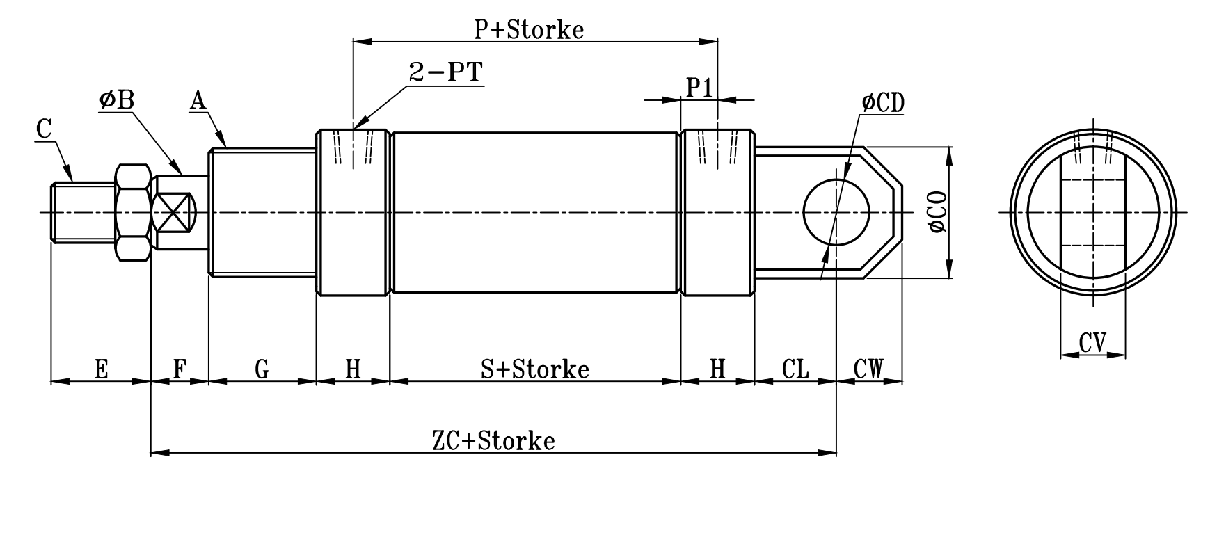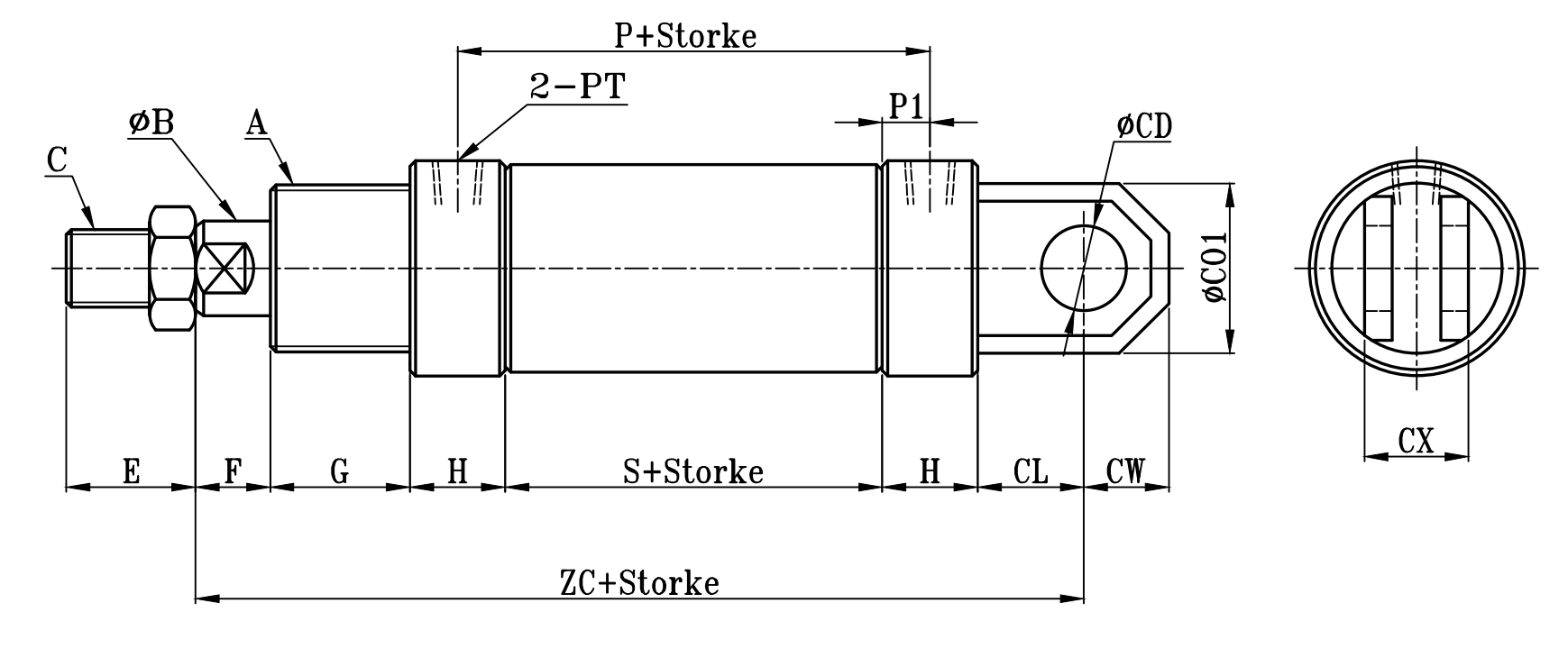 缸徑 BORE | A | ΦB | C | E | F | G | H | ΦI | P | P1 | PT | S | ZC | ΦCD | CL | CW | ΦCO | ΦCO1 | CV | CX |