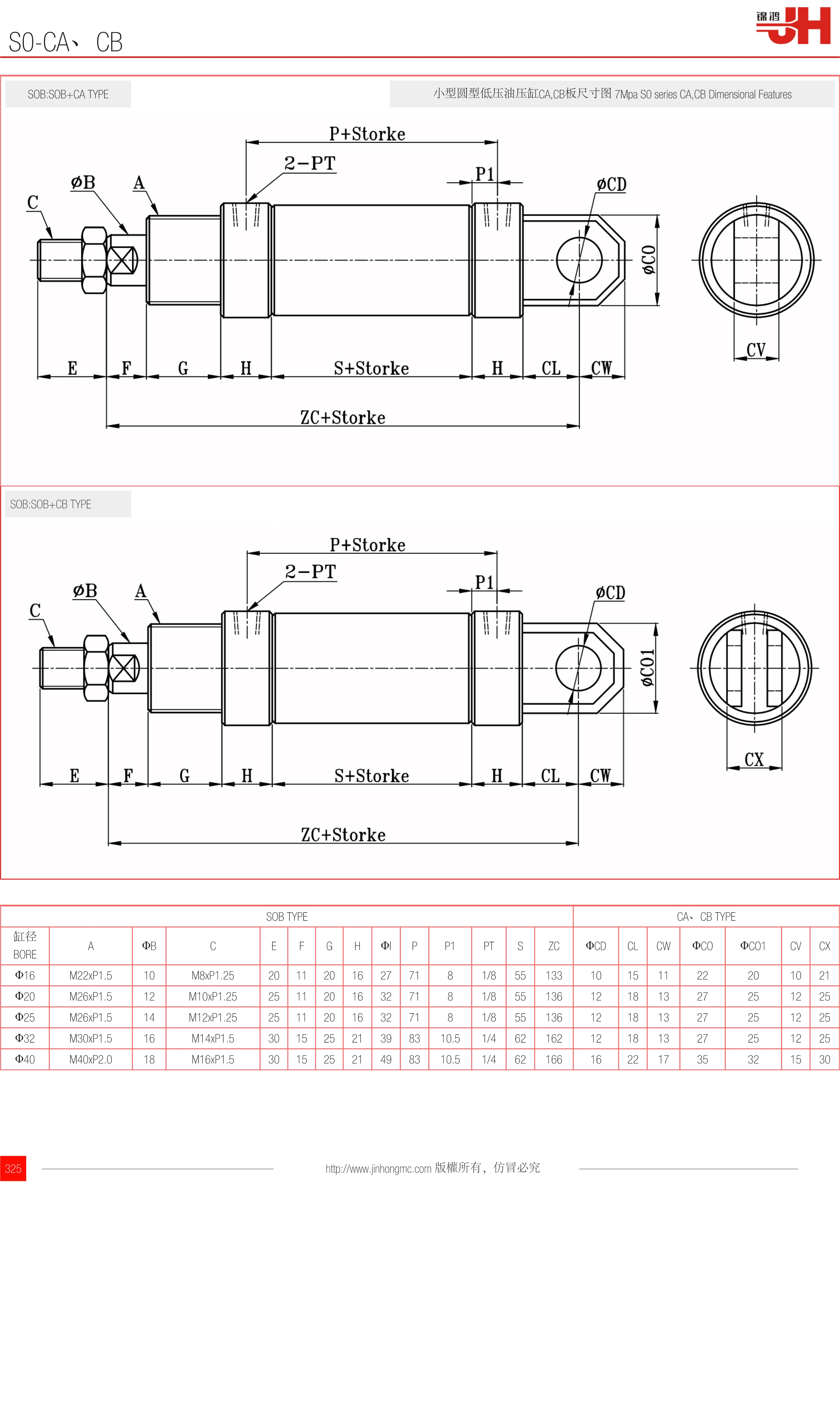 SOB:SOB+CA TYPE | 小型圓型低壓油壓缸CA,CB板尺寸圖 7Mpa S0 series CA,CB Dimensional Features |