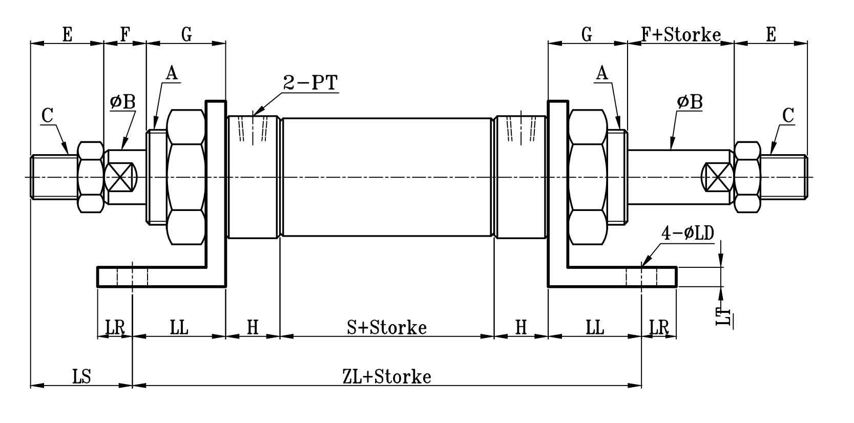 缸徑 BORE | A | ΦB | C | E | F | G | H | ΦI | P | P1 | PT | S | LS | ZL | ΦLD | LH | LN | LL | LR | LT | LX | LY |
