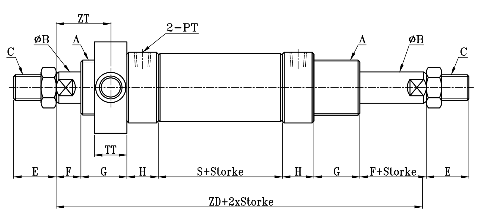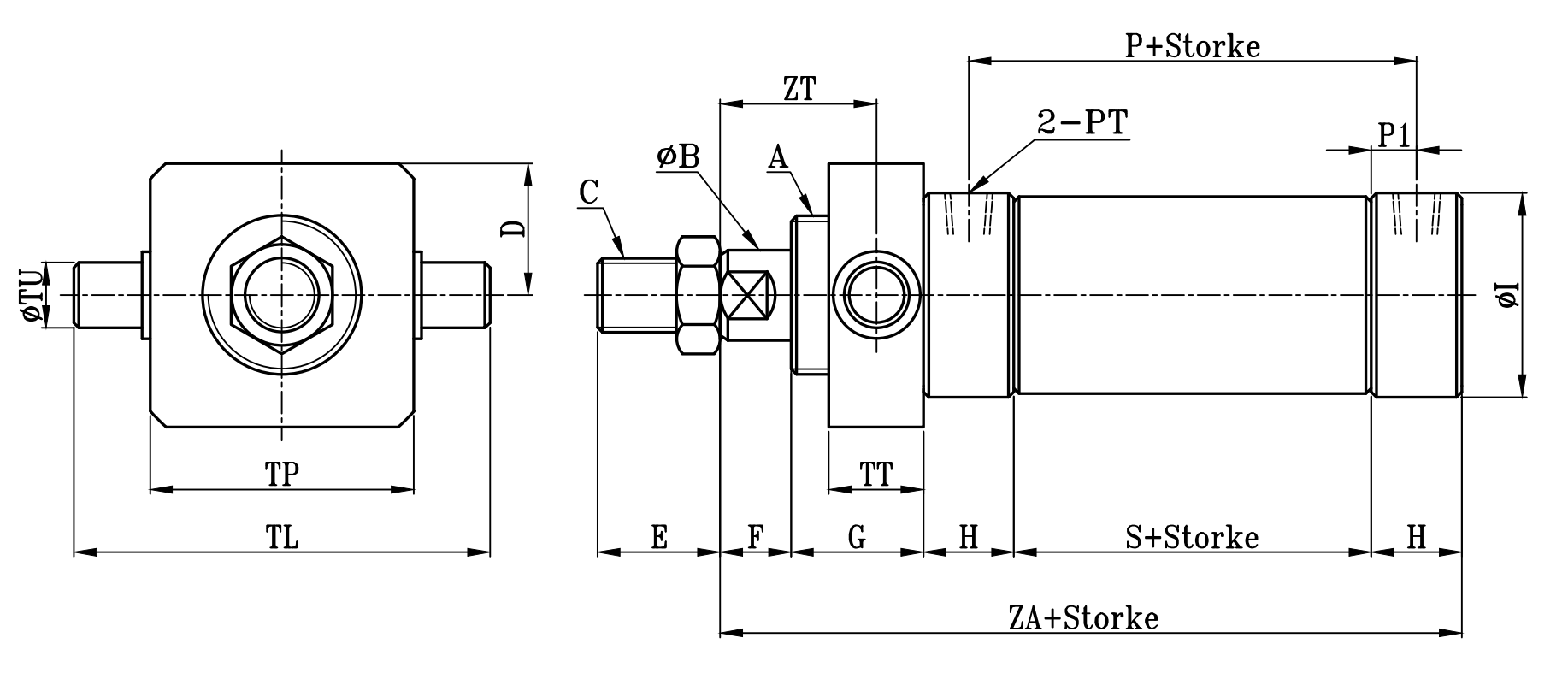 缸徑 BORE | A | ΦB | C | E | F | G | H | ΦI | P | P1 | PT | S | ZA | ZD | ZT | TL | TP | TT | ΦTU | D |