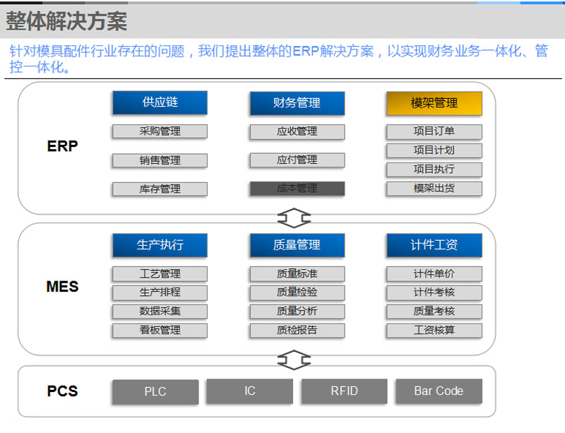 針對(duì)模具配件廠商存在的管理難點(diǎn),提出了“ERP+MES”的綜合解決方案,實(shí)現(xiàn)財(cái)務(wù)業(yè)務(wù)一體化、管控一體化。