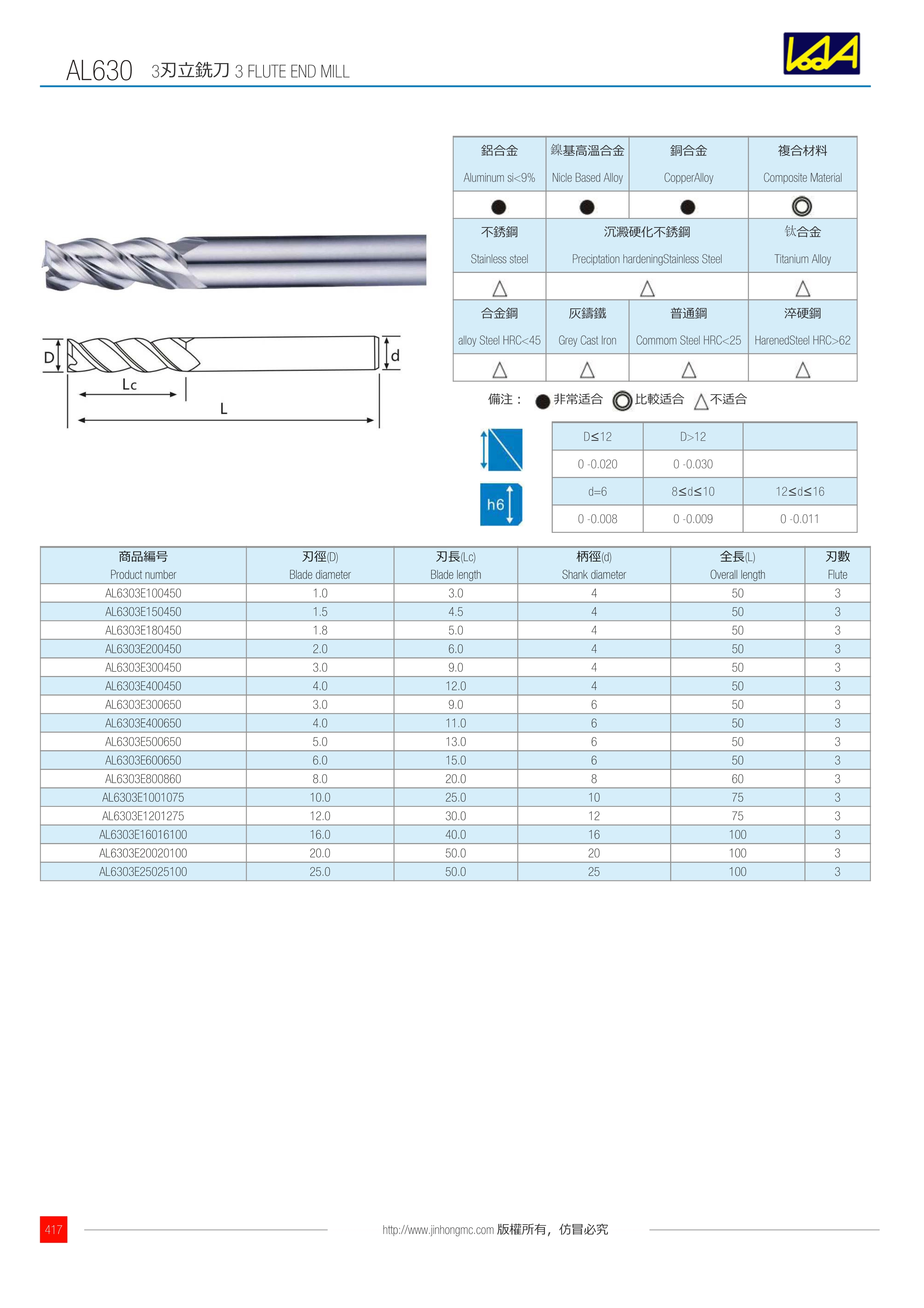 商品編號 Product number | 刃徑(D) Blade diameter | 刃長(Lc) Blade length | 柄徑(d) Shank diameter | 全長(L) Overall length | 刃數(shù) Flute |