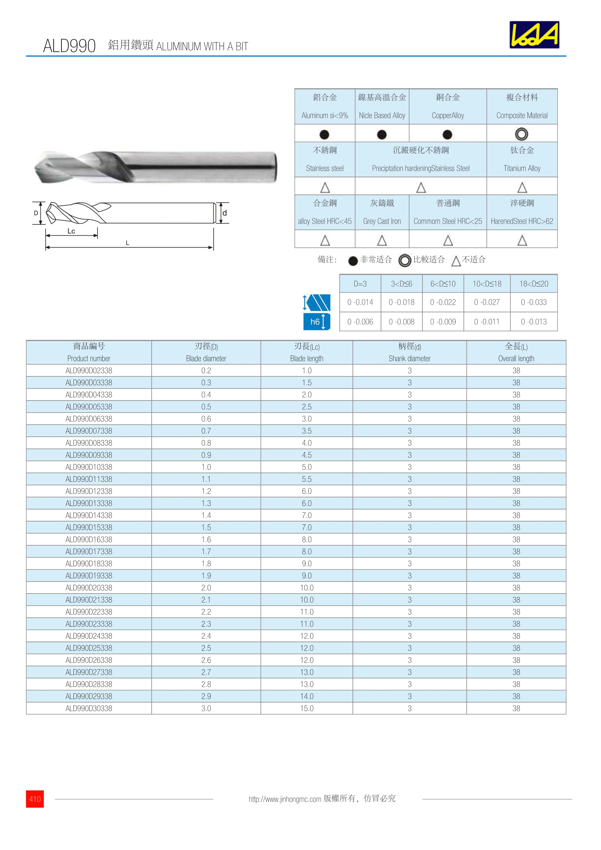 商品編號(hào) Product number | 刃徑(D) Blade diameter | 刃長(zhǎng)(Lc) Blade length | 柄徑(d) Shank diameter | 全長(zhǎng)(L) Overall length |