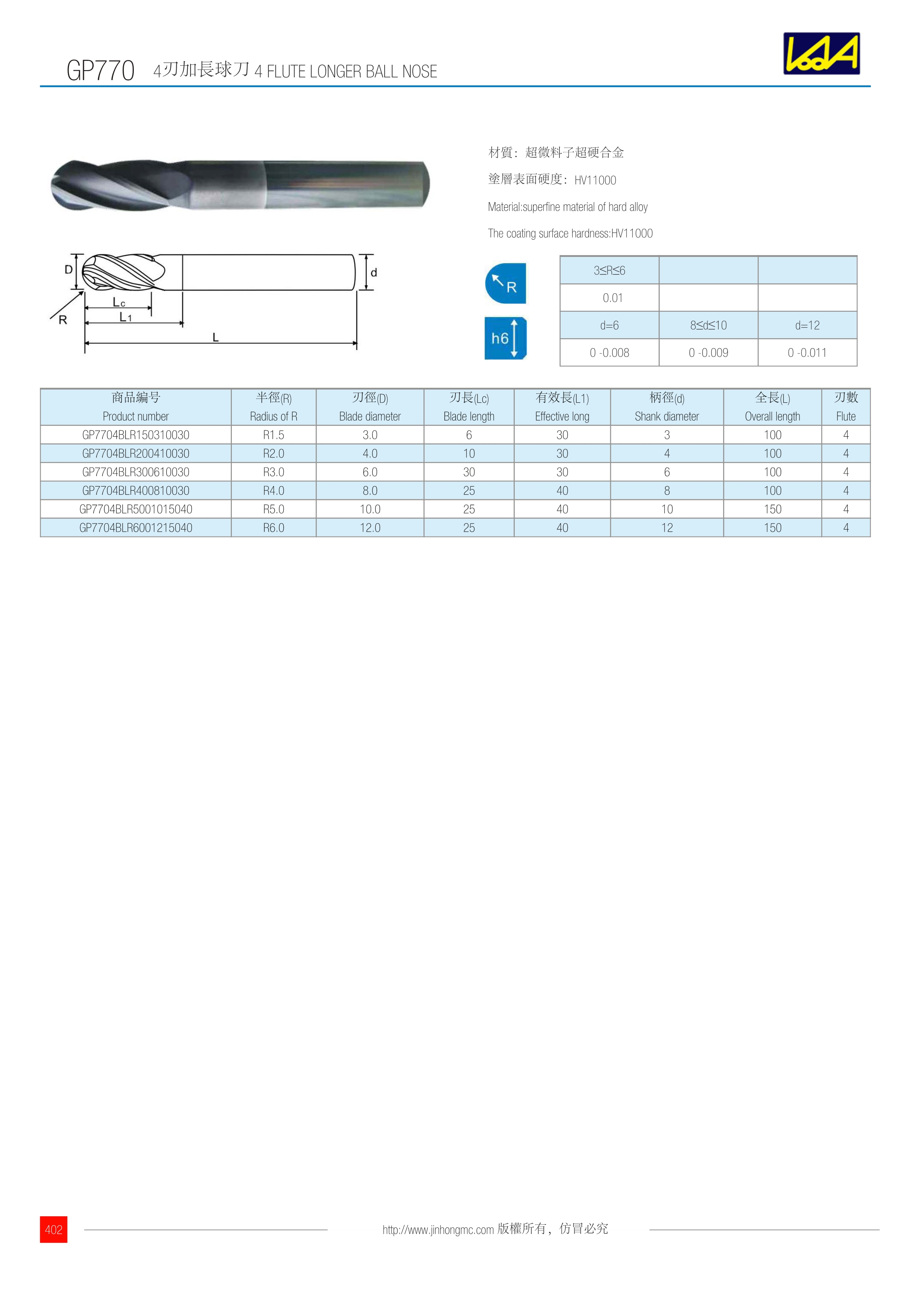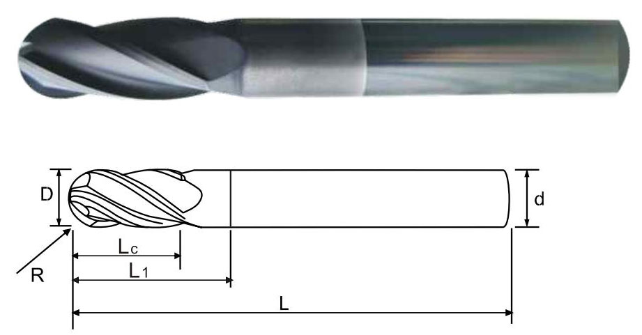商品編號(hào) Product number | 半徑(R) Radius of R | 刃徑(D) Blade diameter | 刃長(Lc) Blade length | 有效長(L1) Effective long | 柄徑(d) Shank diameter | 全長(L) Overall length | 刃數(shù) Flute |