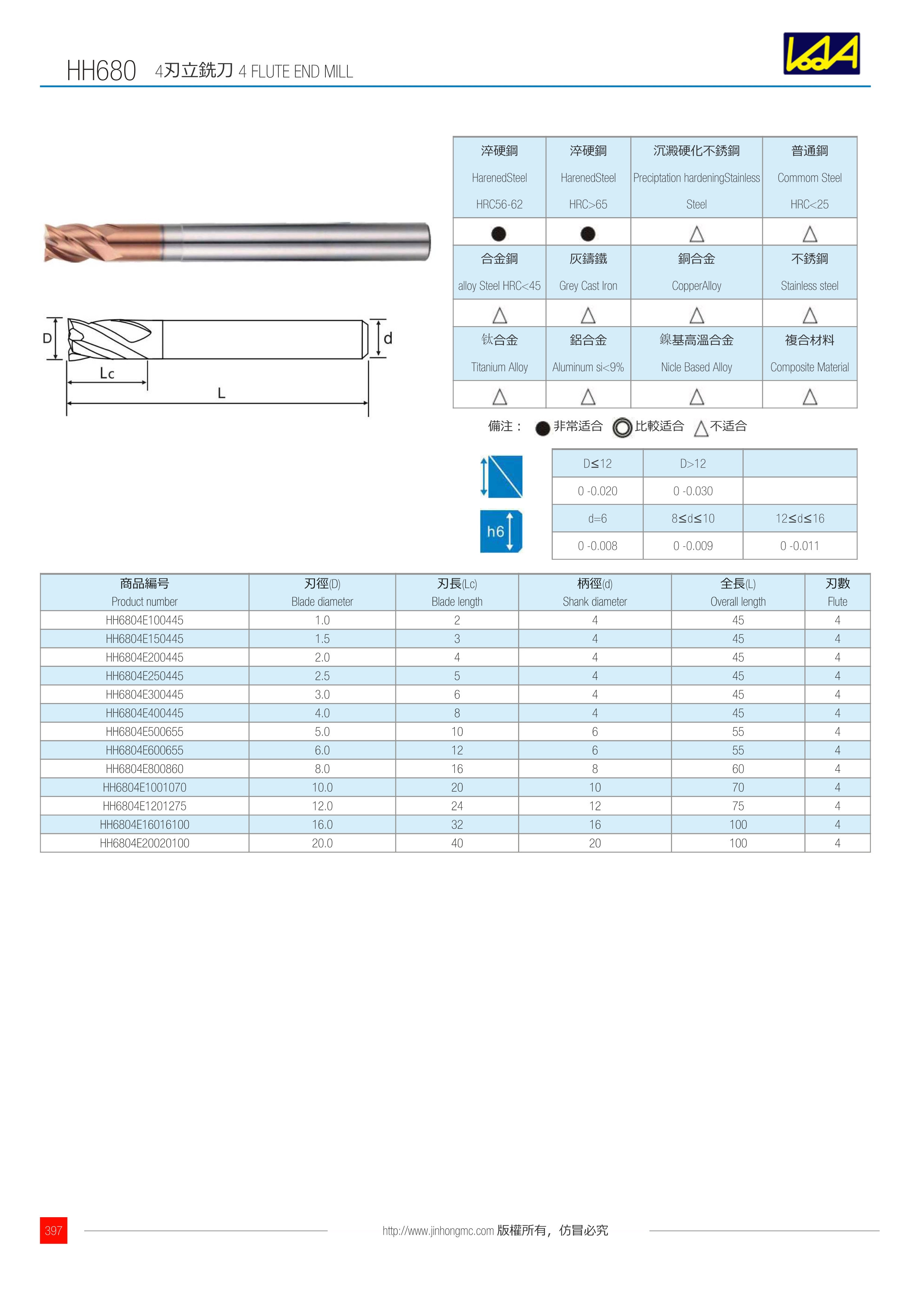 合金鋼 alloy Steel HRC<45 | 灰鑄鐵 Grey Cast Iron | 銅合金 CopperAlloy | 不銹鋼 Stainless steel |