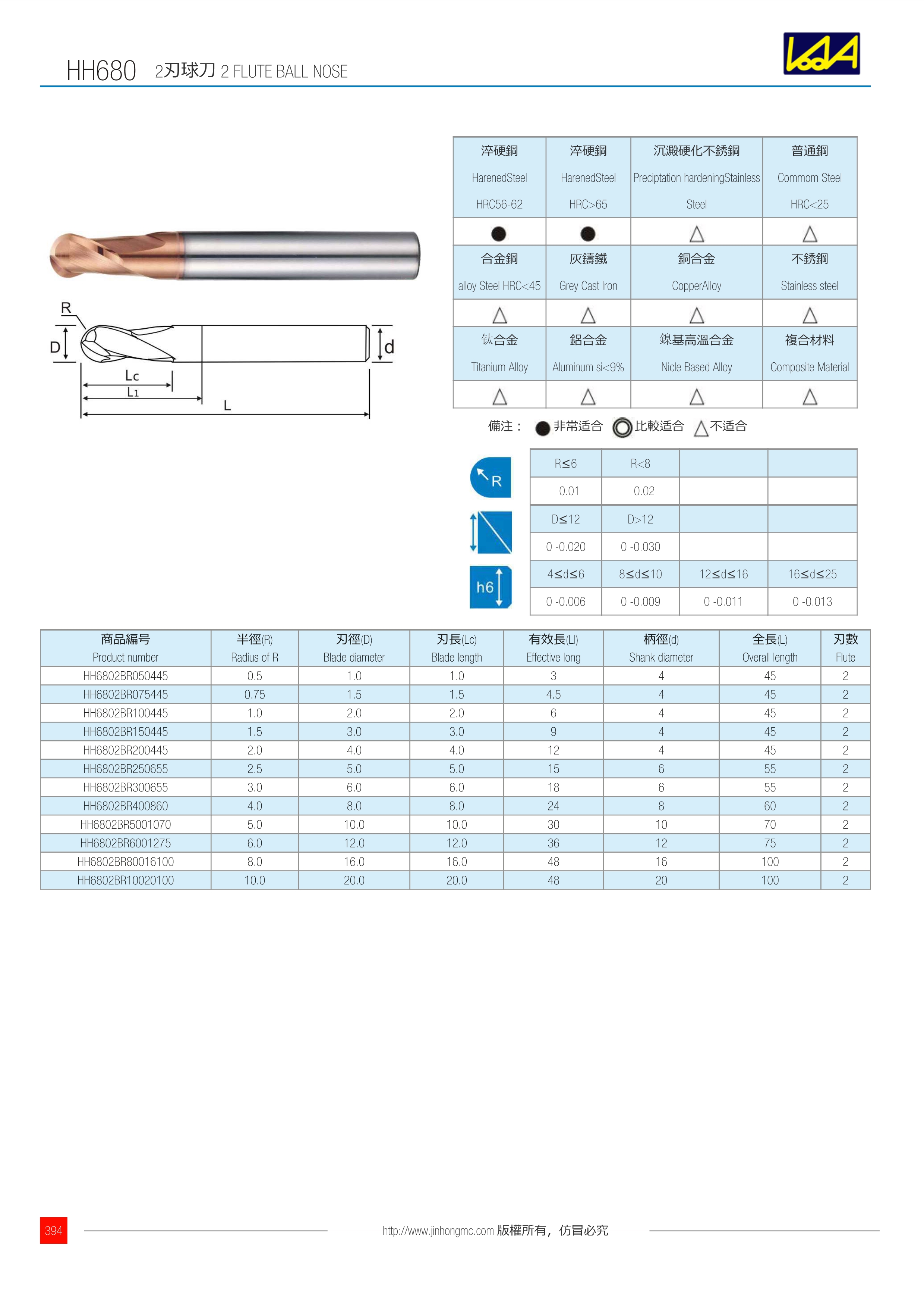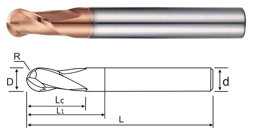 商品編號 Product number | 半徑(R) Radius of R | 刃徑(D) Blade diameter | 刃長(Lc) Blade length | 有效長(Ll) Effective long | 柄徑(d) Shank diameter | 全長(L) Overall length | 刃數(shù) Flute |