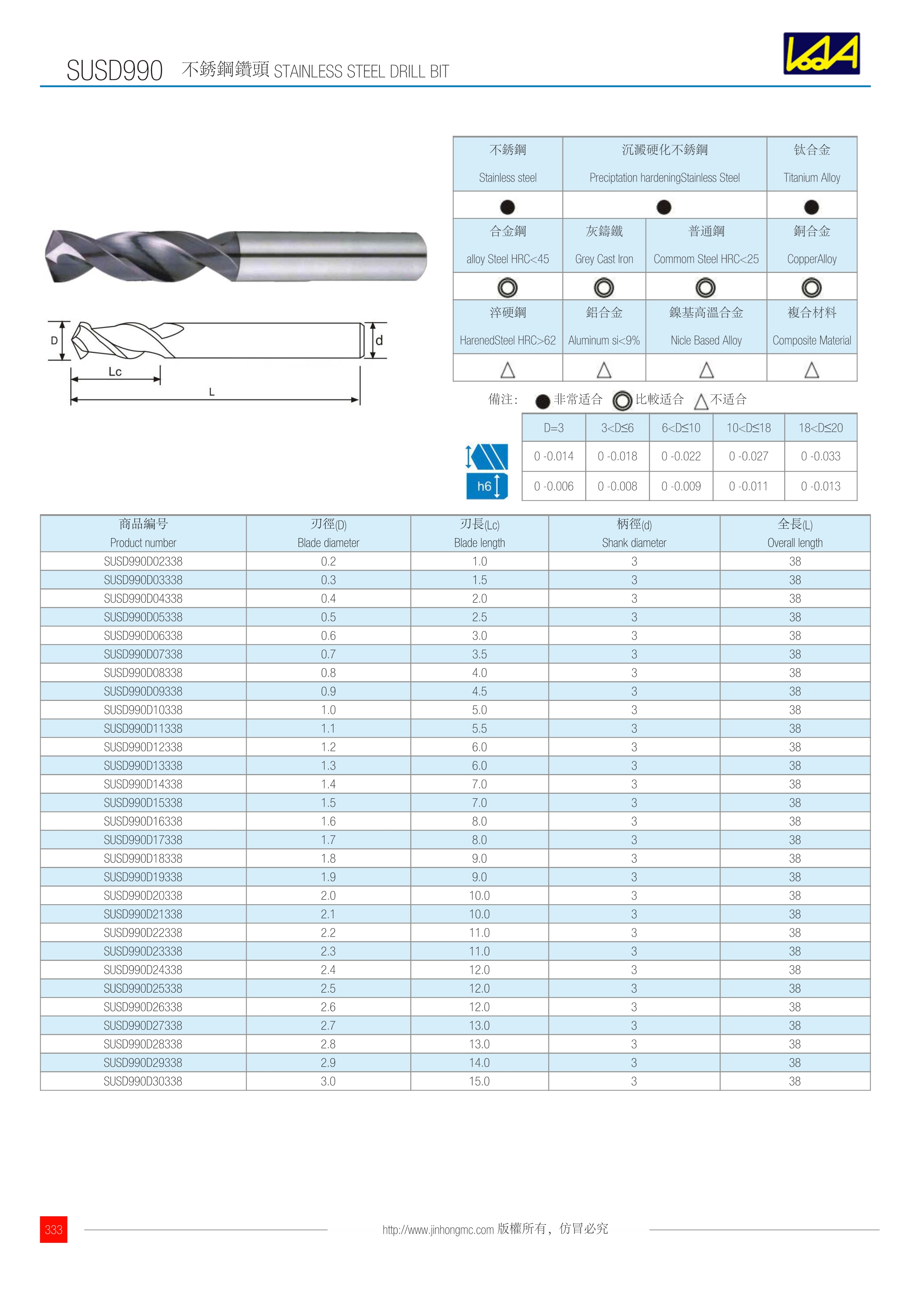 商品編號 Product number | 刃徑(D) Blade diameter | 刃長(Lc) Blade length | 柄徑(d) Shank diameter | 全長(L) Overall length |
